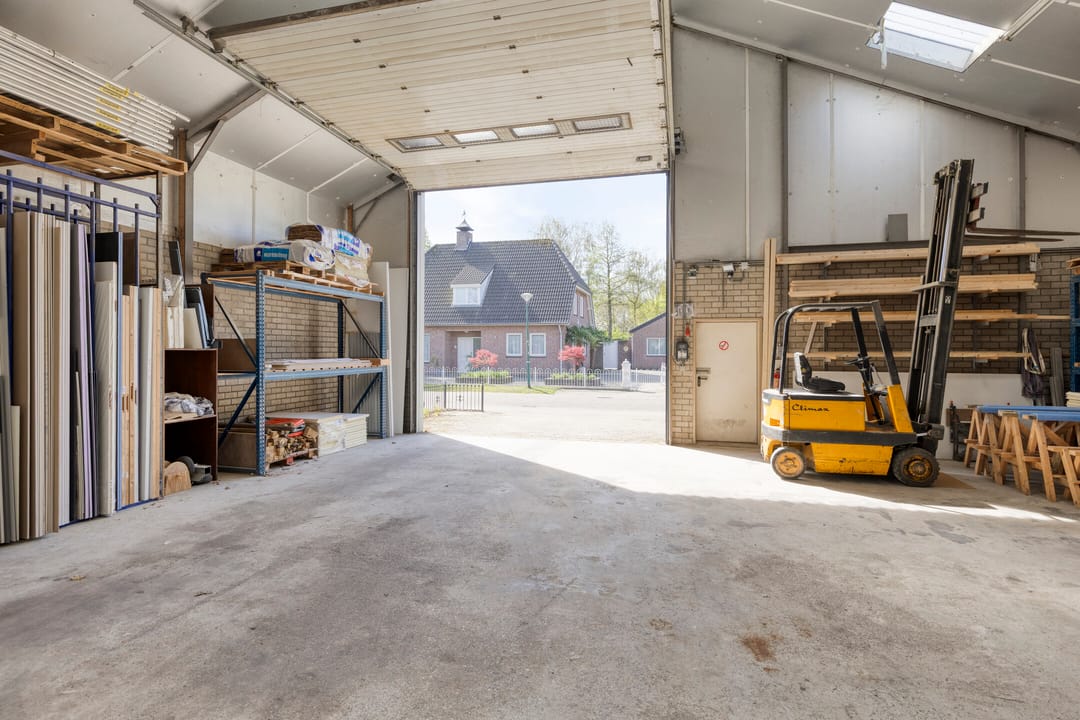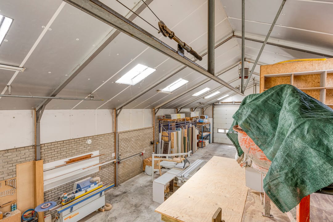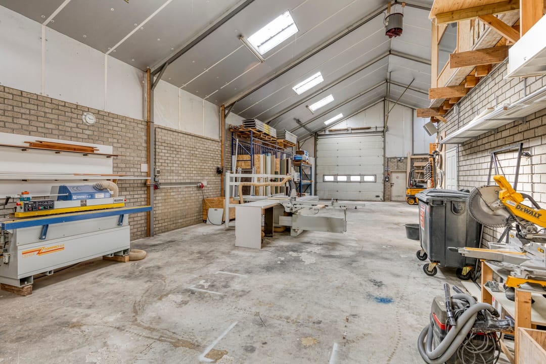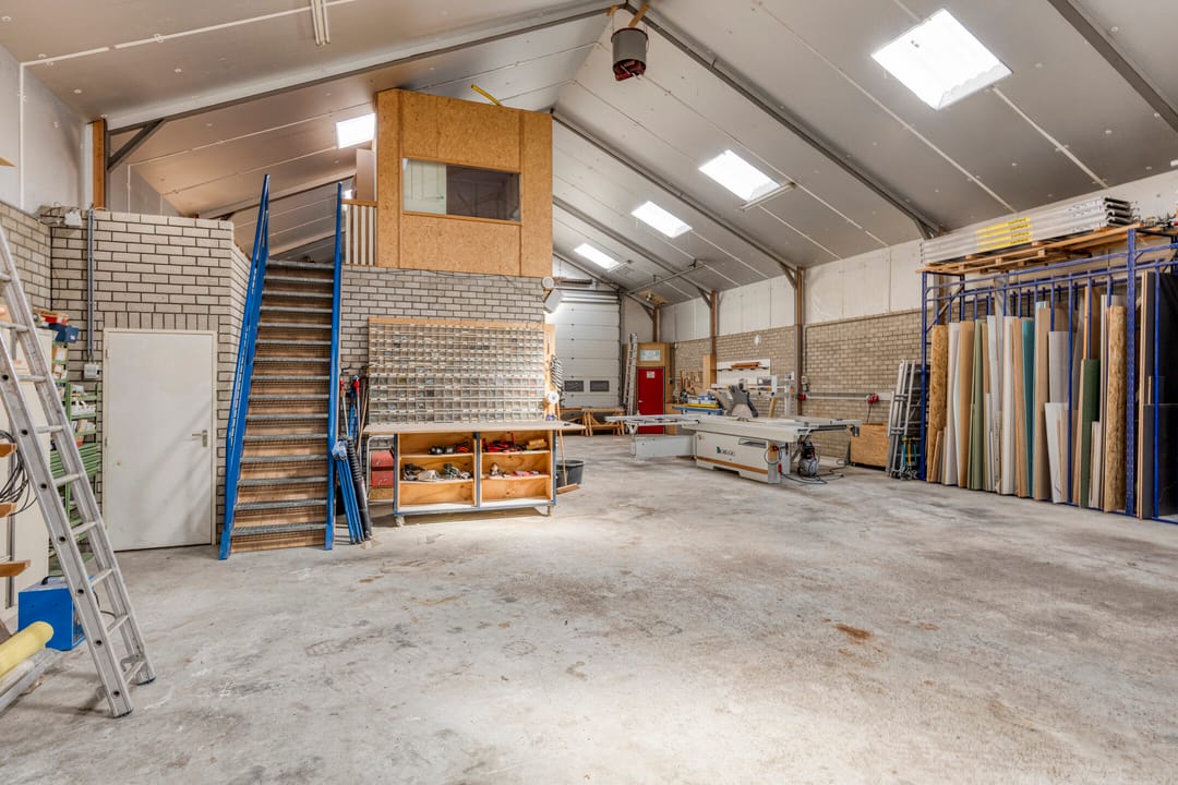 Achter de woning bevindt zich een ruime en praktisch ingedeelde bedrijfshal, verdeeld in twee delen.