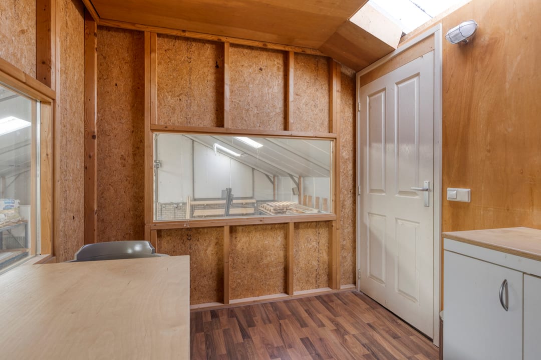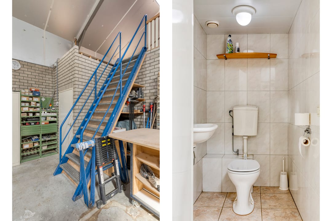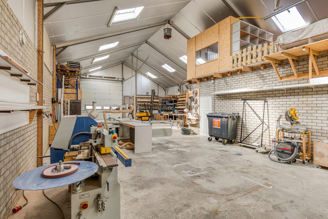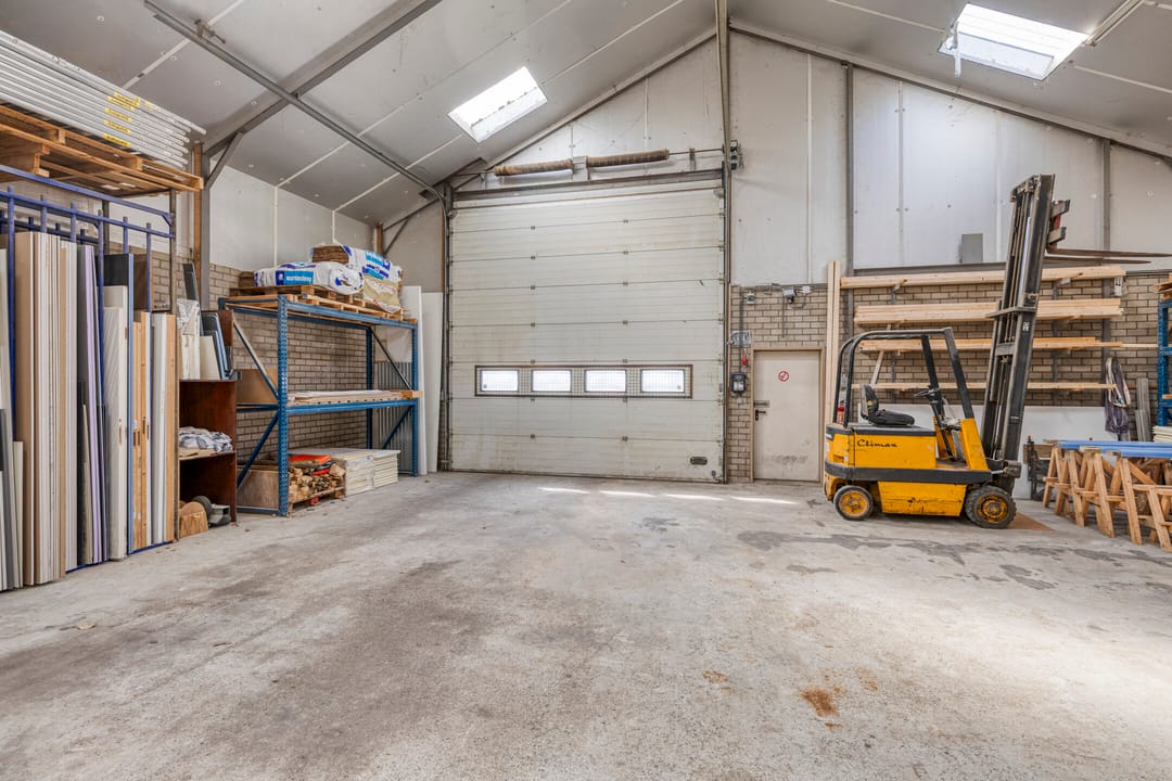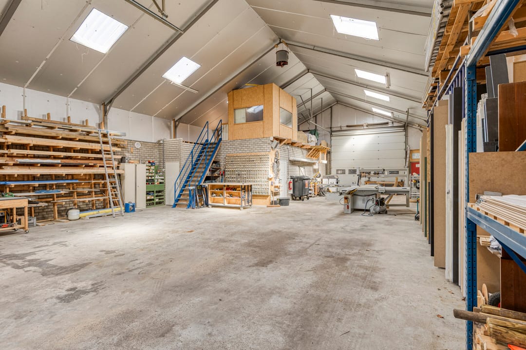 Achter de woning bevindt zich een ruime en praktisch ingedeelde bedrijfshal, verdeeld in twee delen.