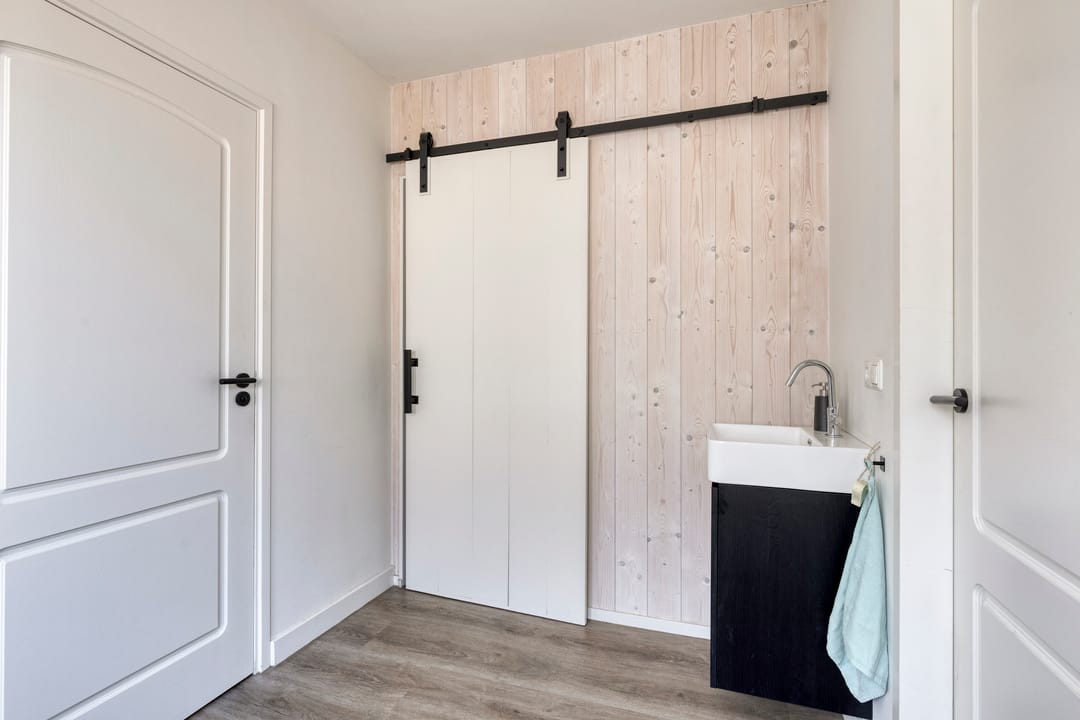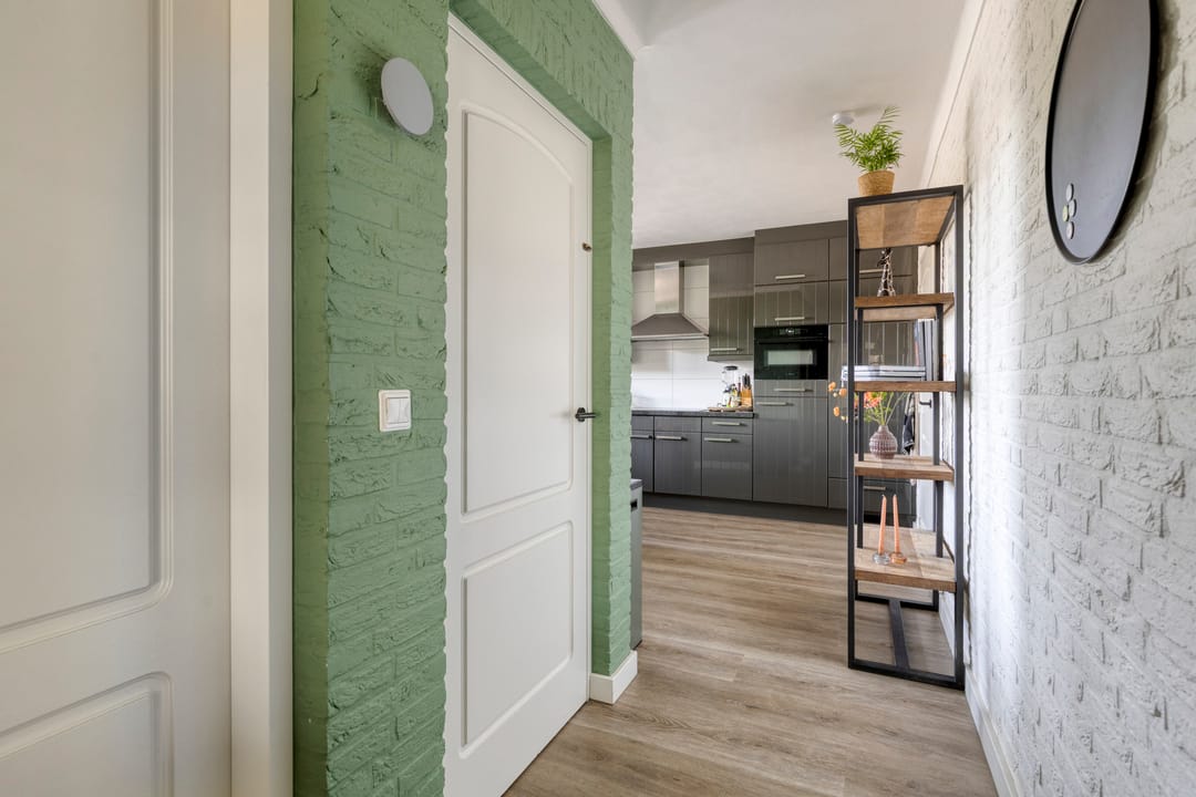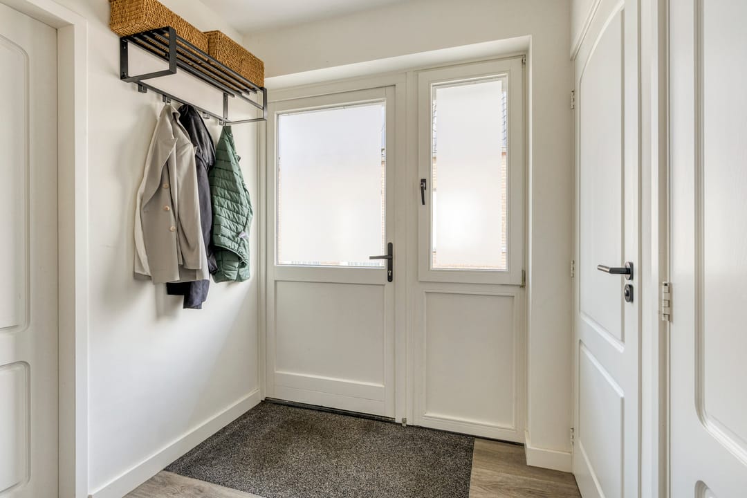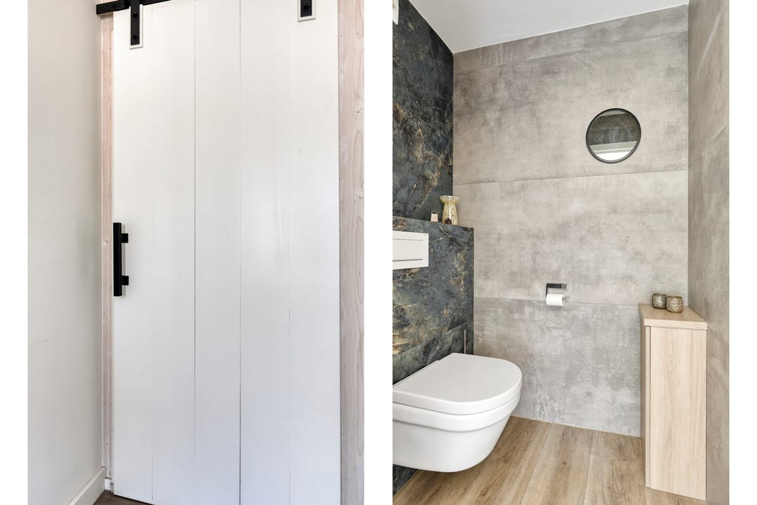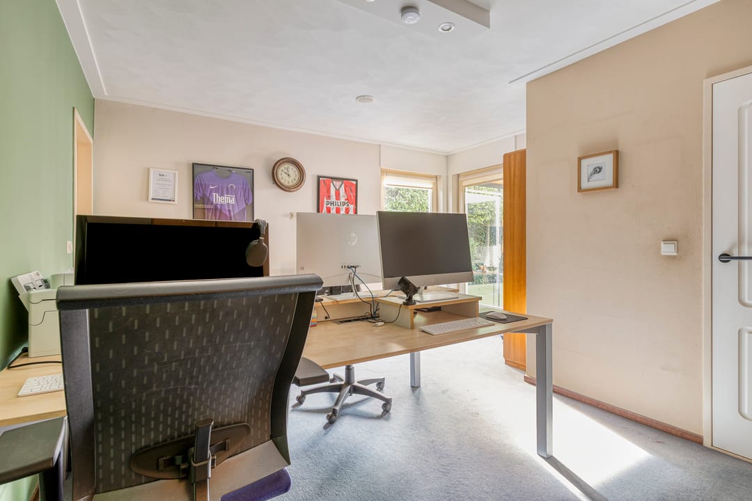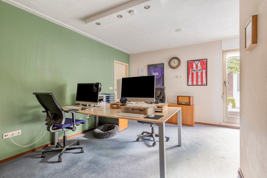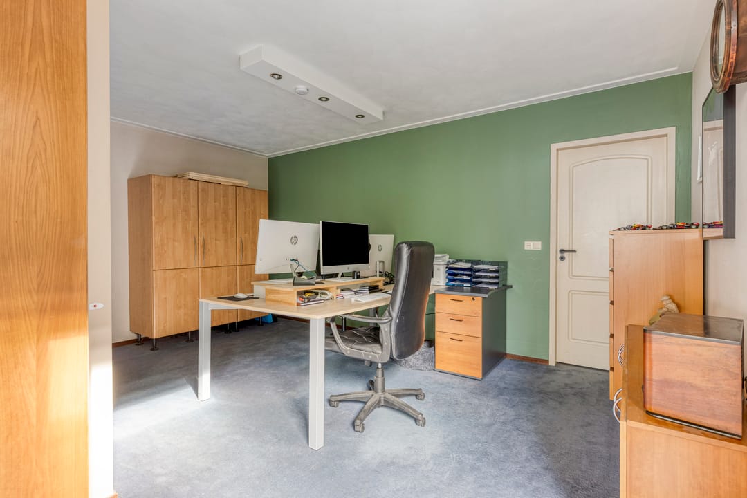 Door middel van de zijdeur (links van de woning) komt u in een tweede hal met toilet, een ruime badkamer, de gang met witgoedaansluitingen en een praktische werkkamer – ideaal voor kantoor aan huis of een andere creatieve invulling.