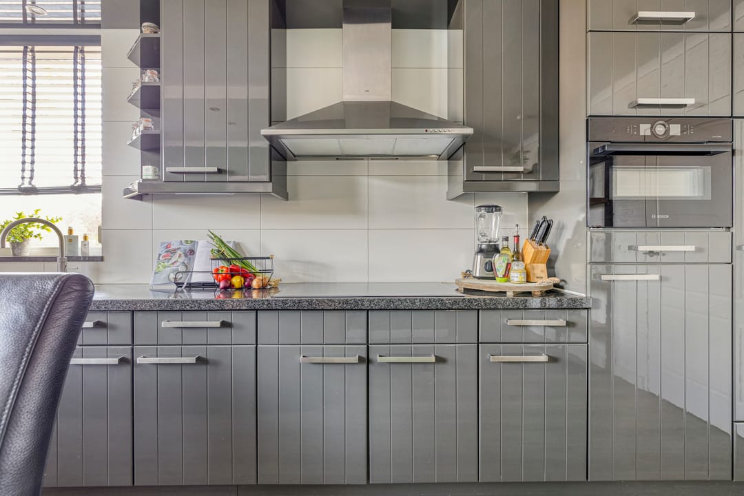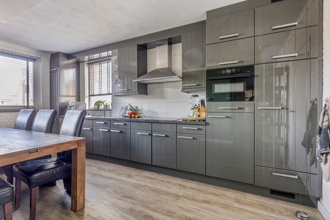 De hoogglanskeuken is volledig uitgerust met diverse inbouwapparatuur, waaronder een Quooker, vaatwasser, oven, inductiekookplaat, afzuigkap en koelkast.