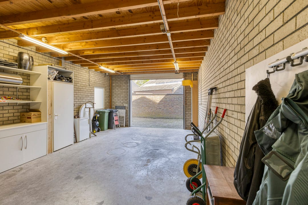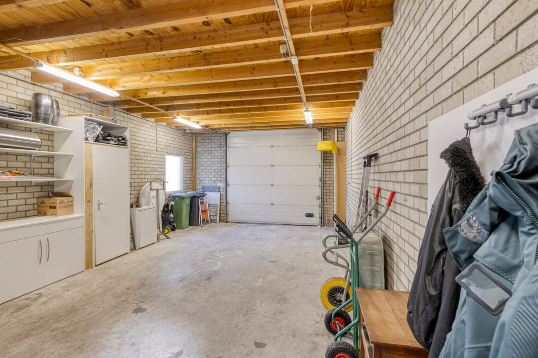 Het kleinere gedeelte is geschikt als garage of werkruimte, terwijl de grote hal is voorzien van een automatische overheaddeur aan de straatzijde en een handbediende overheaddeur aan de achterzijde.