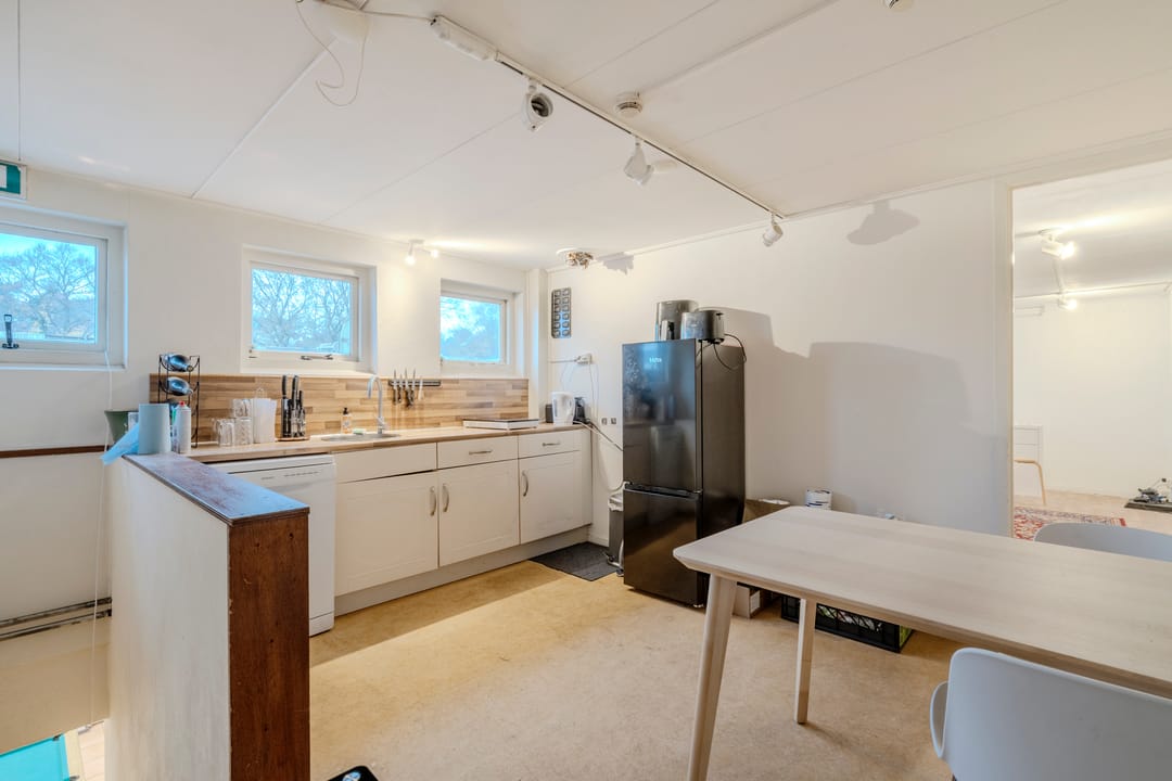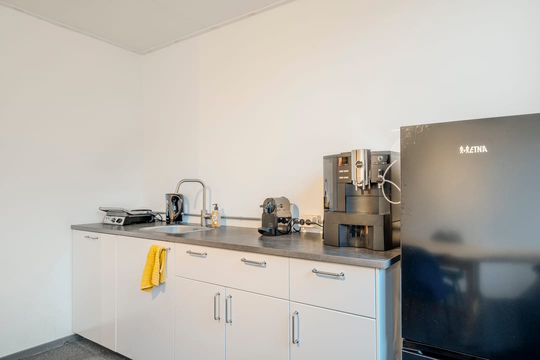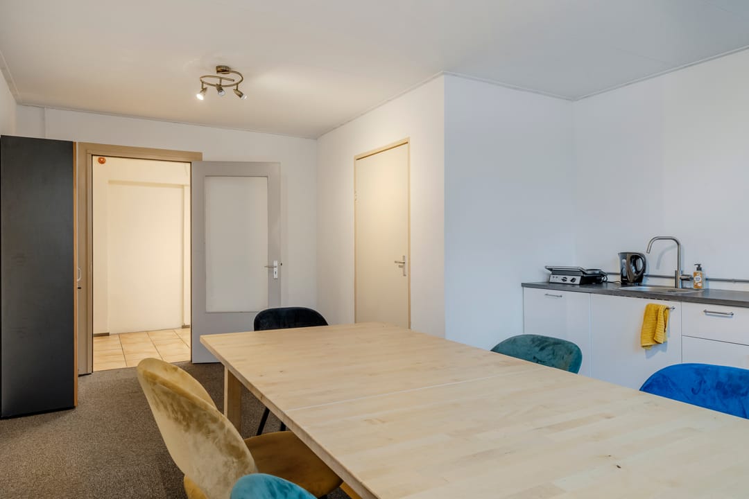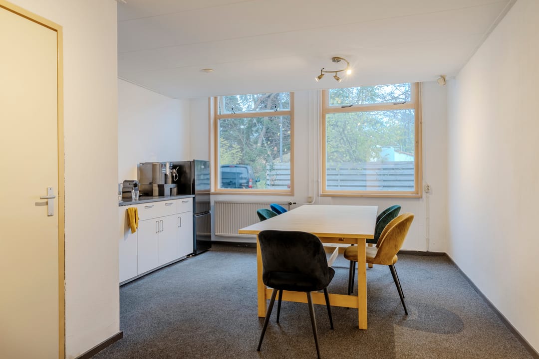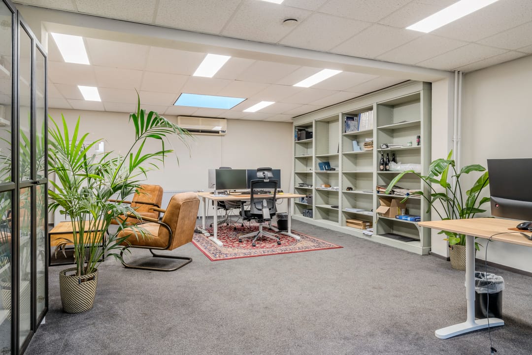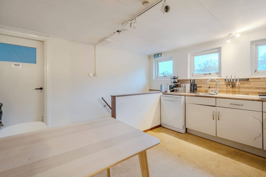 1e verdieping: Via de vaste trap kom je op de 1e verdieping, waar nog eens 2 extra kantoorkamers zijn. De overloop is ingericht met een keukenblok/ een pantry, waardoor deze ook bijzonder geschikt is als extra kantine of ontspanningsruimte.