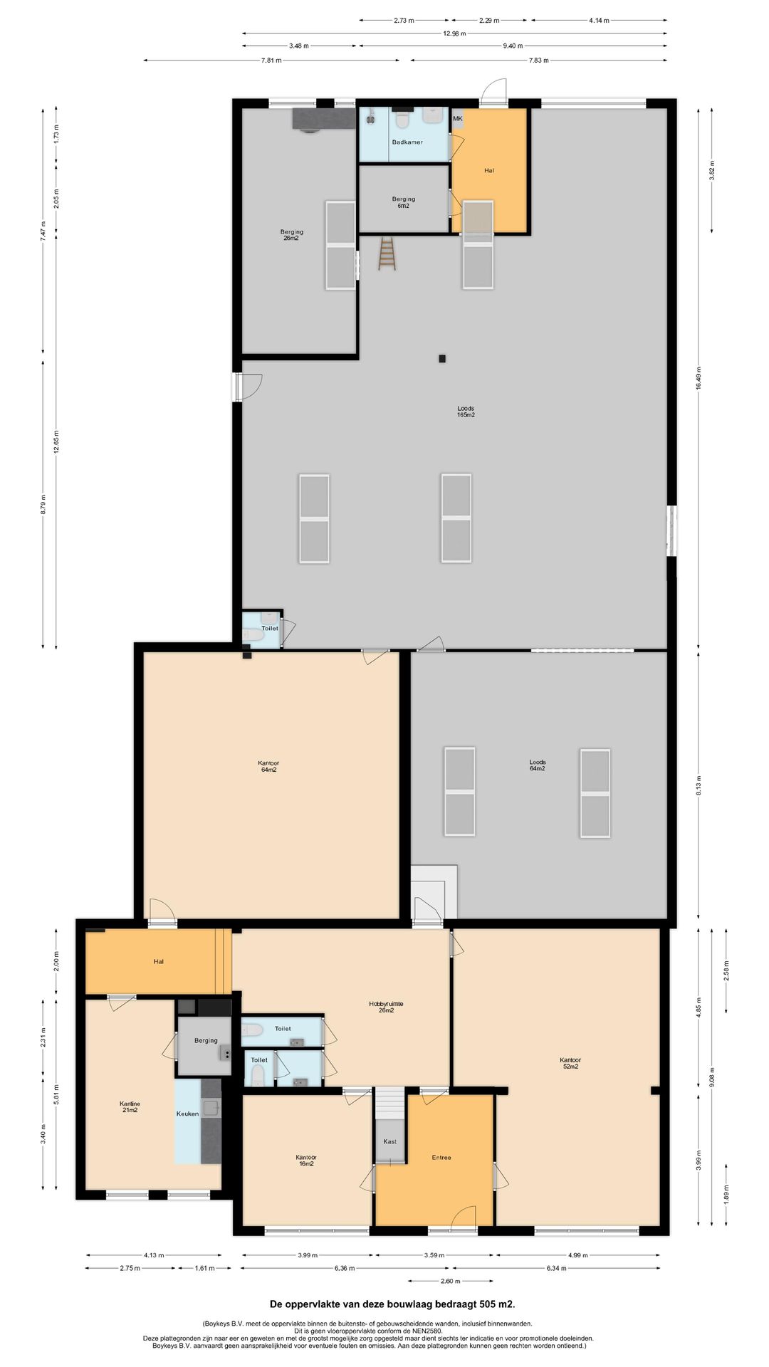Indeling: Entree, royale ontvangsthal met inpandige trapkast met bergruimte, een doorgang naar meerdere kantoorruimtes, een dubbele toiletruimte met 2 toiletten en fonteintjes. Er zijn op de begane grond maar liefst 5 kantoorkamers aanwezig, waarvan 1 kantoor met een keukenblok en een deur naar een bergruimte met cv-opstelling. Deze ruimte is bijzonder geschikt als kantine of ontspanningsruimte. Vanuit de tussenhal is er een deur naar de achtergelegen bedrijfshal. Deze hal is voorzien van een grote overheaddeur. Ideaal voor het laden en lossen. Er zijn grote lichtkoepels aanwezig en er is een loopdeur naar buiten/ de achteringang. In de hal is een doucheruimte met een douche, vaste wastafel en toilet. En er is veel extra opslag-/of bergruimte aanwezig.
