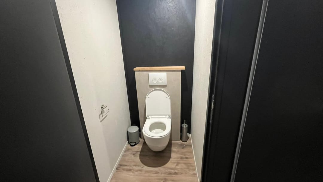 Aan de linkerzijde bevindt zich een pantry en toilet, terwijl aan de rechterzijde een urinoir is gesitueerd.