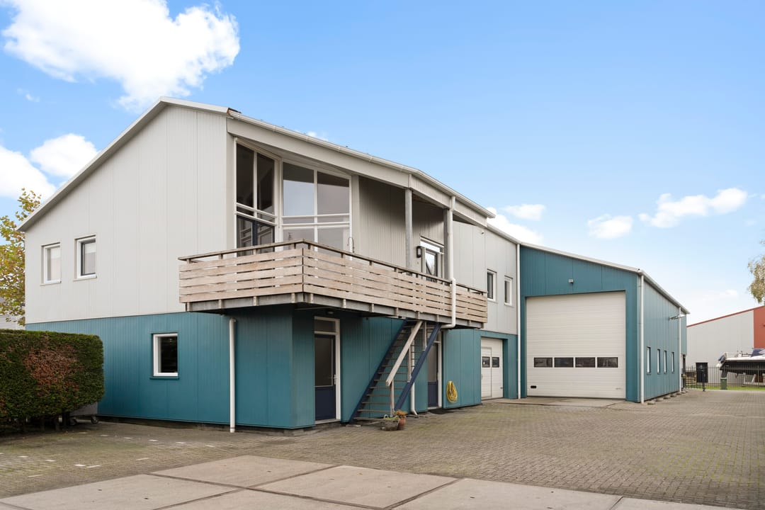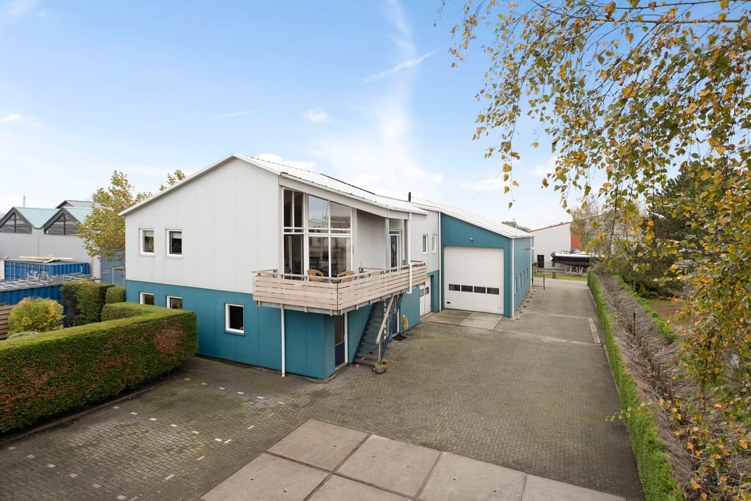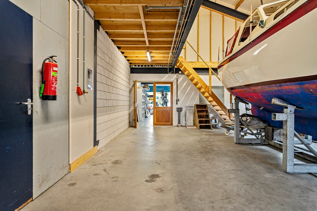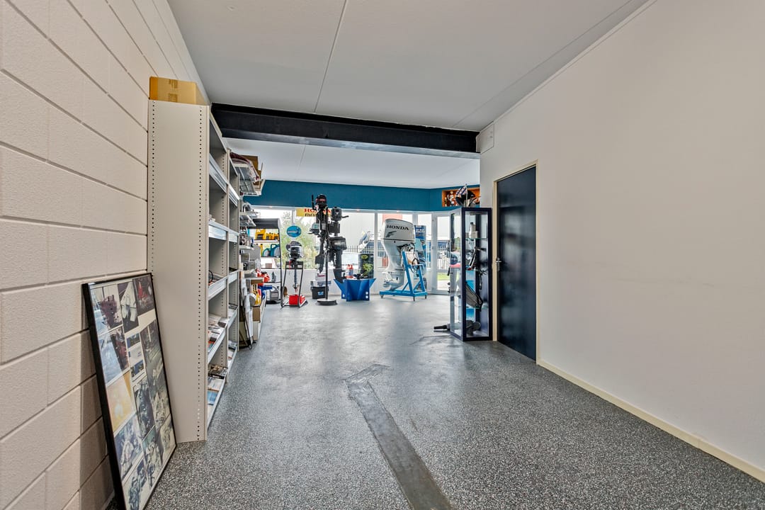 Het gebouw bestaat in hoofdlijnen uit showroom/kantoorruimte, een royale bedrijfshal aan de voorzijde met eigen entree en kantoorruimte, 2e kleinere bedrijfshal, werkplaats en een bovenwoning bestaande uit een grote woonkamer met open keuken, drie ruime slaapkamers, badkamer, balkon en grote zolderetage met stahoogte en veel opslagruimte. Op het terrein voor het pand zijn parkeerplaatsen voor bezoekers, het zij- en achterterrein biedt ruimte voor zakelijke activiteiten. Aan de achterzijde bevinden zich vier royale ligplaatsen in eigen water.