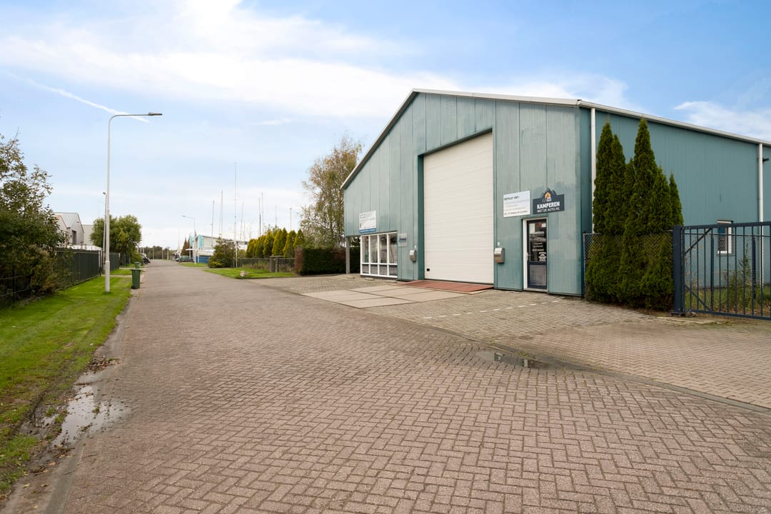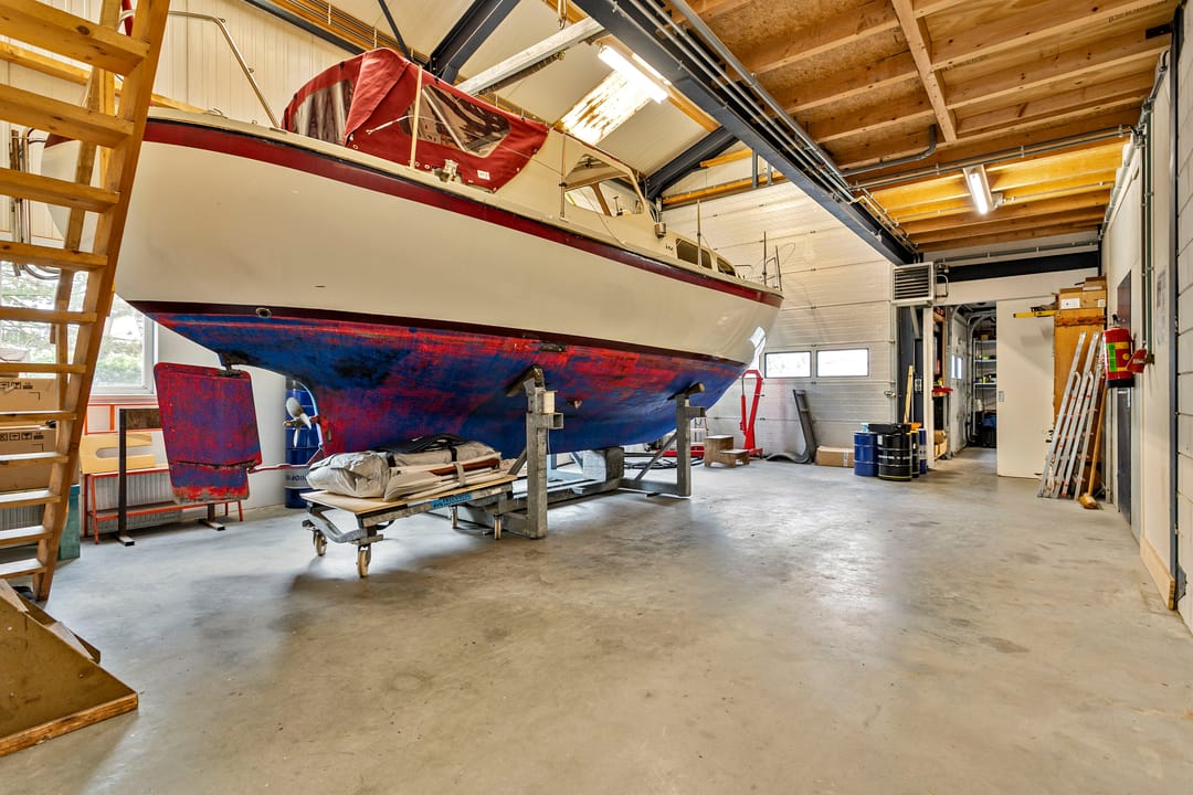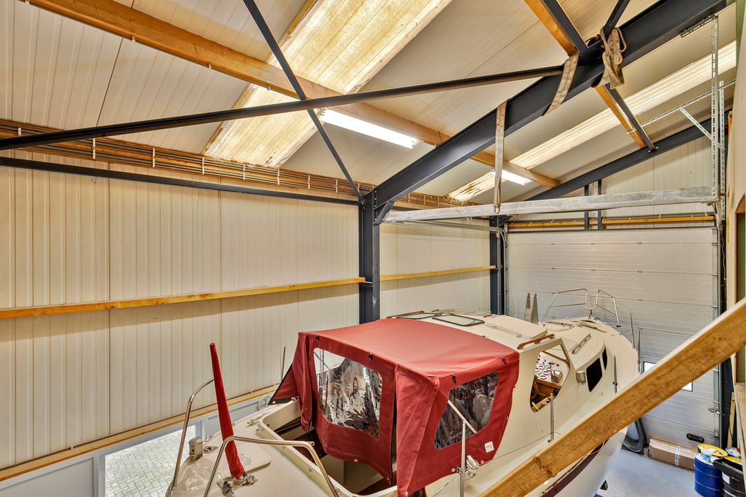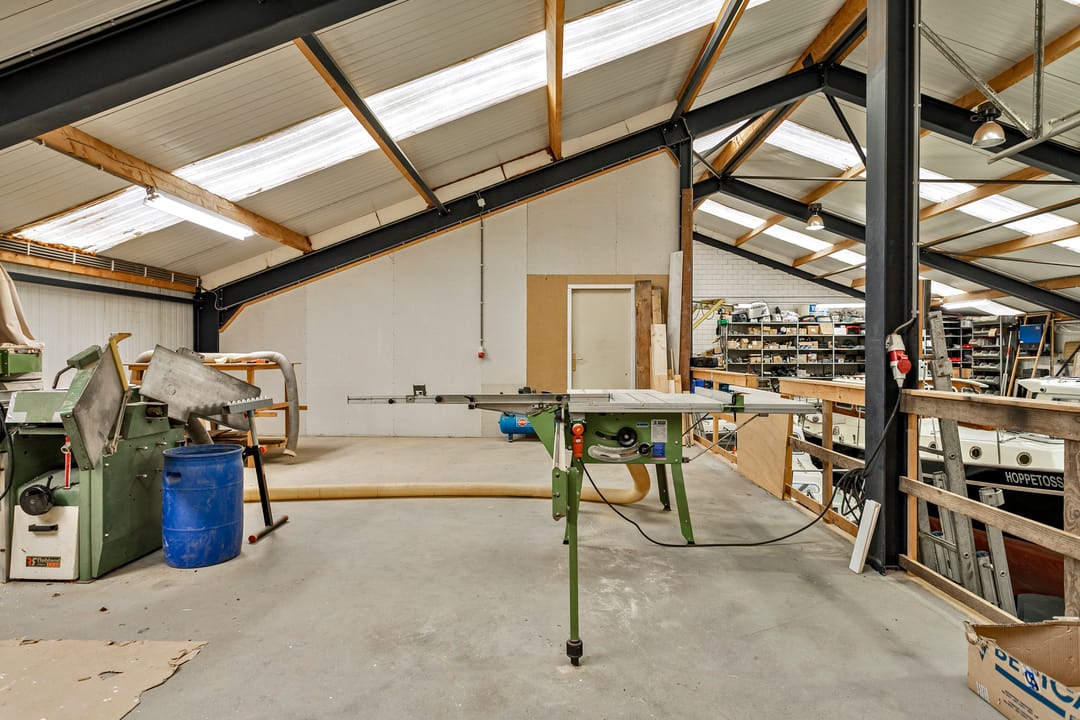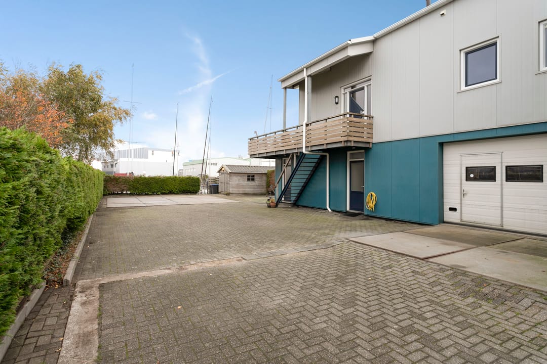Het gebouw bestaat in hoofdlijnen uit showroom/kantoorruimte, een royale bedrijfshal aan de voorzijde met eigen entree en kantoorruimte, 2e kleinere bedrijfshal, werkplaats en een bovenwoning bestaande uit een grote woonkamer met open keuken, drie ruime slaapkamers, badkamer, balkon en grote zolderetage met stahoogte en veel opslagruimte. Op het terrein voor het pand zijn parkeerplaatsen voor bezoekers, het zij- en achterterrein biedt ruimte voor zakelijke activiteiten. Aan de achterzijde bevinden zich vier royale ligplaatsen in eigen water.