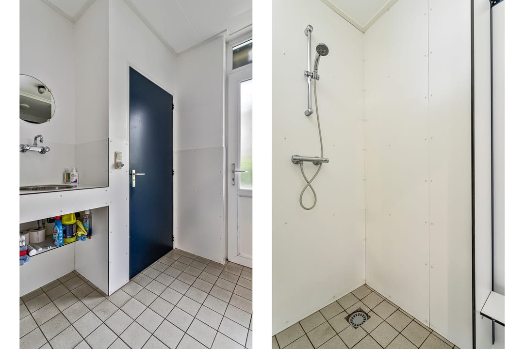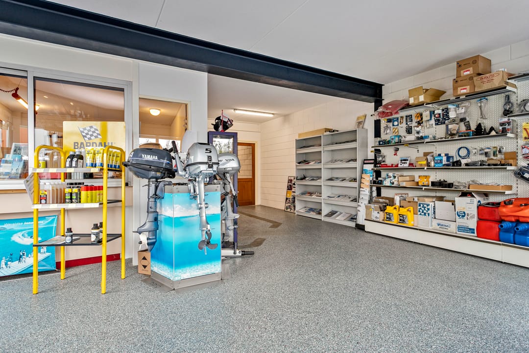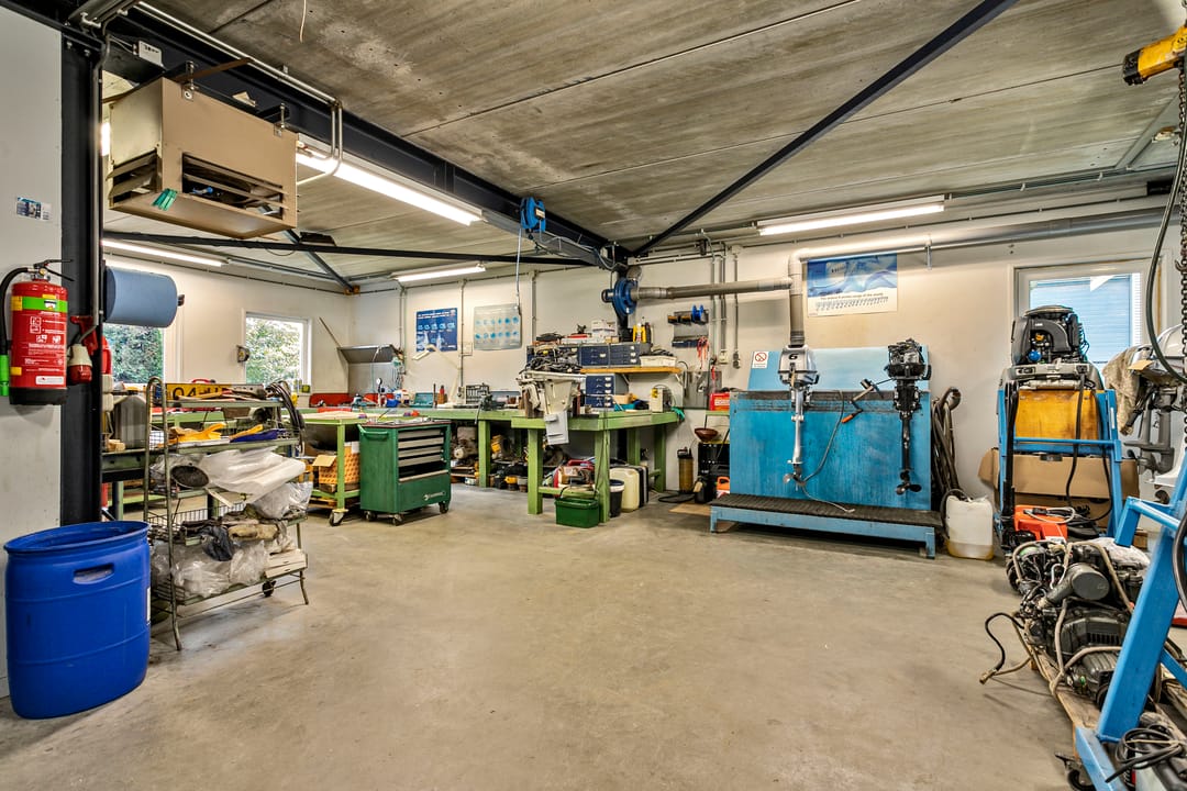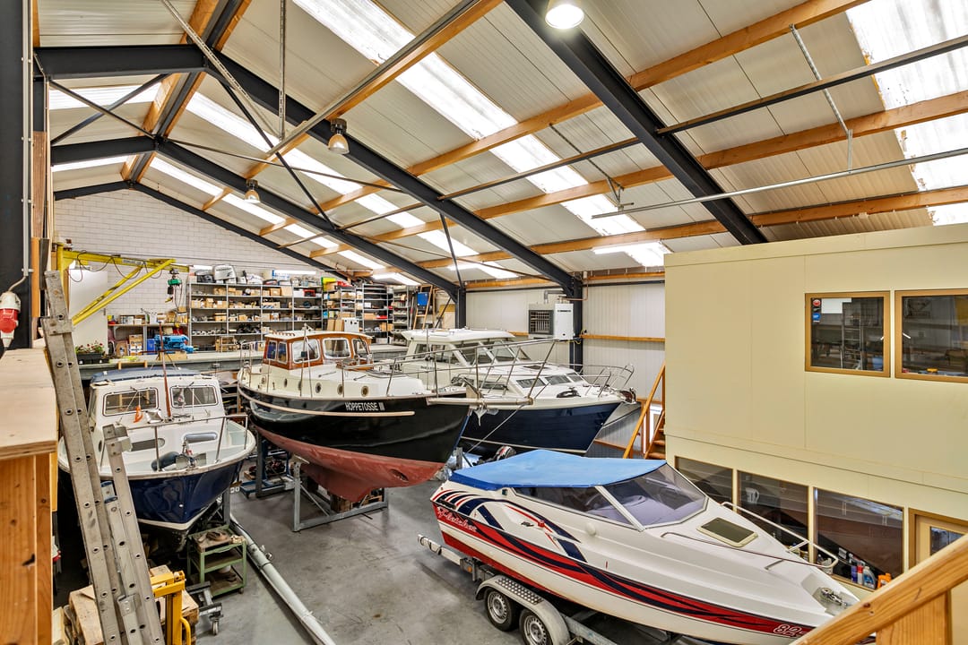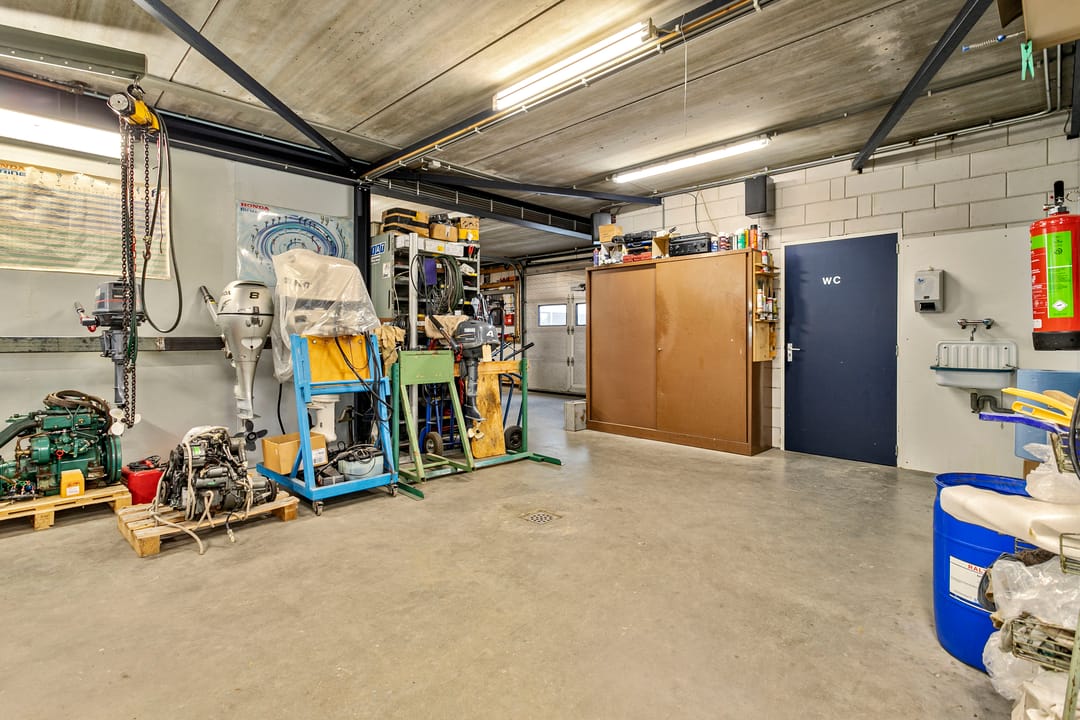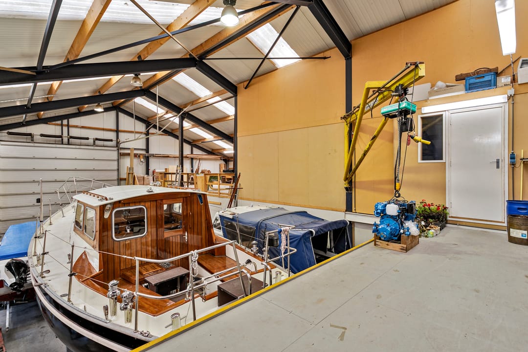 Links van deze hal bevindt zich de ingang showroom met kantoor van ca. 60 m2. Achter de showroom ligt een tweede hal (2) van ca. 65 m2 met hoge overheaddeur (4 x 4 m) en doorgang naar de huidige werkplaats (3). De werkplaats is ca. 155 m2 groot, heeft een eigen overheaddeur (ca. 3 x 3 m, met loopdeur), en een toiletgroep met douche ten dienste van de vier ligplaatsen en de werkplaats.