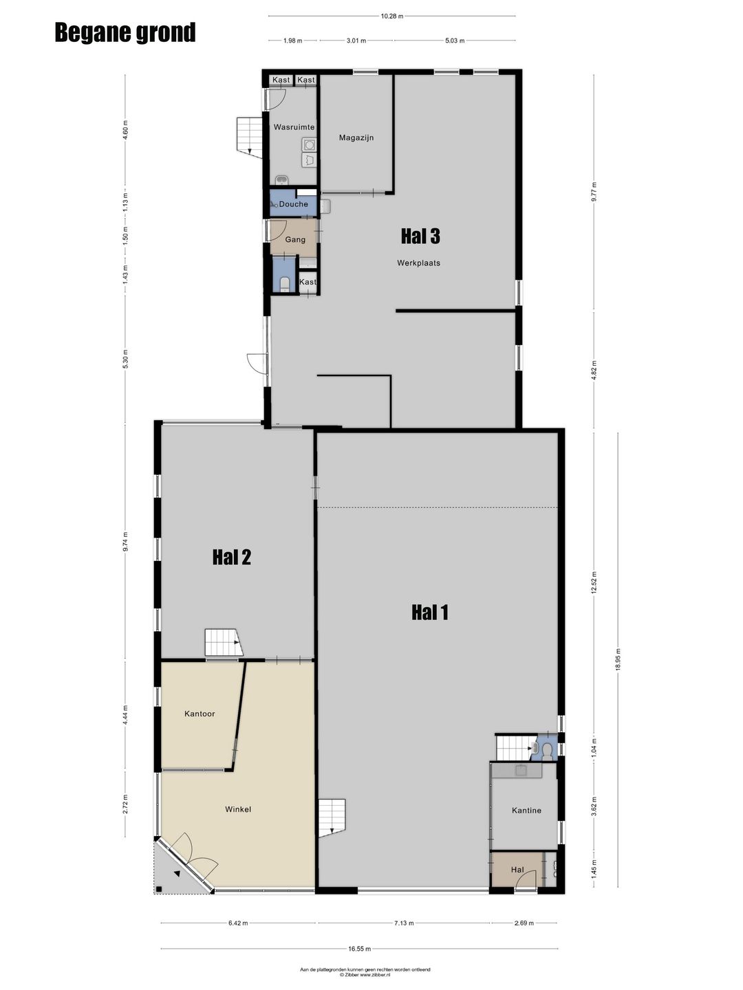 Bedrijfsruimte: Royale hal (1) van ca. 200 m2 met een overheaddeur ( ca.5 x 5,5 m), eigen entree, meterkast, toilet, kantine met een bovengelegen kantoorruimte. Verdiepingsvloer boven de showroom van ca. 60 m2 en entresol van ca. 30 m2 t.b.v. deze hal.