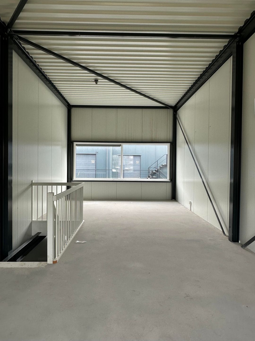 Beide bedrijfsunits bestaan uit een begane grond met een vaste trap naar een vaste (betonnen- vloer) verdieping. Op de verdieping zijn grote raampartijen aanwezig aan de spoorzijde (West) en het binnenplein (Oost). Elke unit heeft een eigen pantry en een eigen toilet.