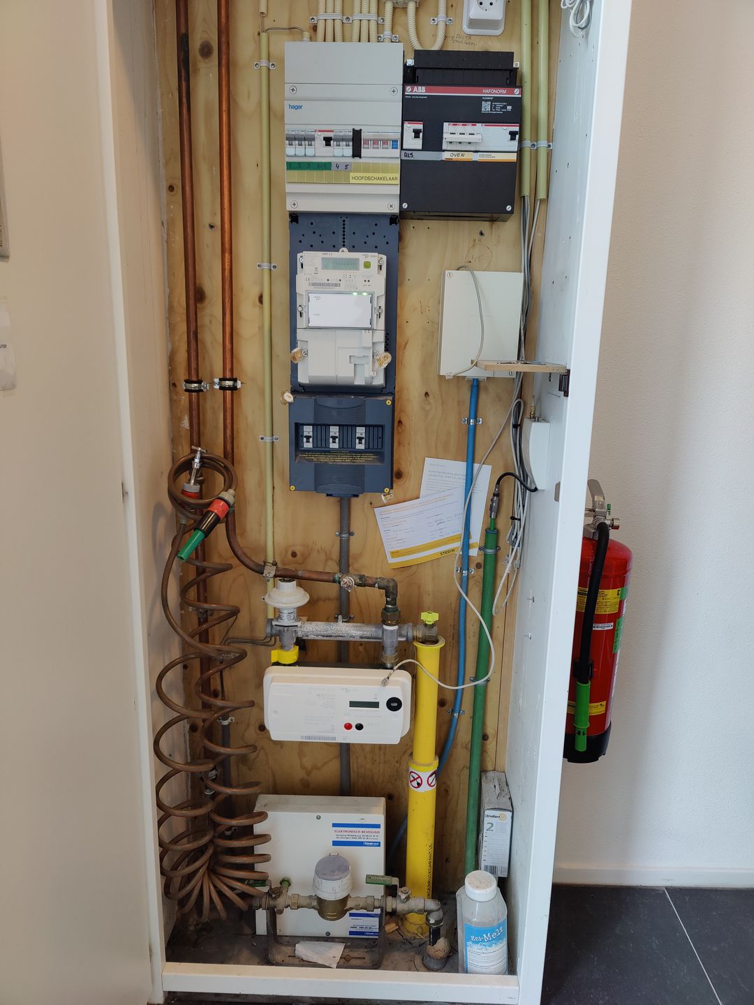 - Begane grond: Entree, gang, meterkast (zie foto) met o.a. ook gas-, water-, kabel-, glasvezel- en KPN-aansluiting. Gang met 2 bergkasten. Trap naar verdieping. Bedrijfsruimte van circa 35 m2 met overheaddeur en een krachtstroompunt.