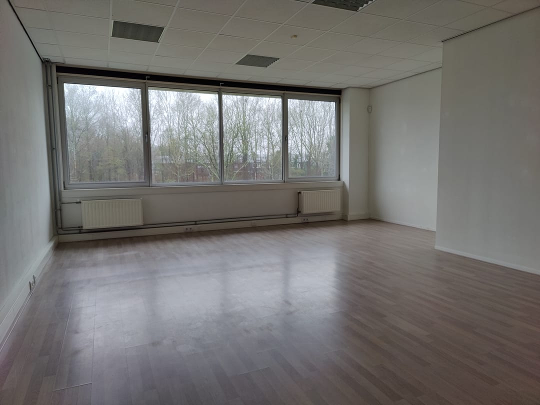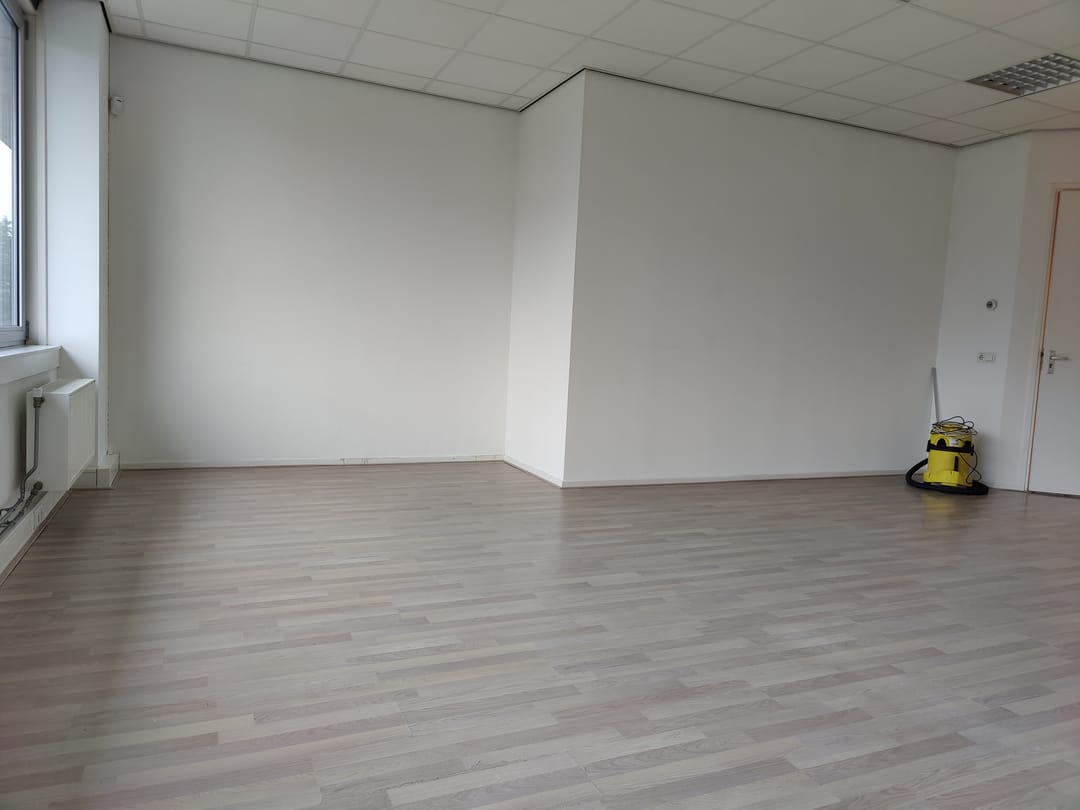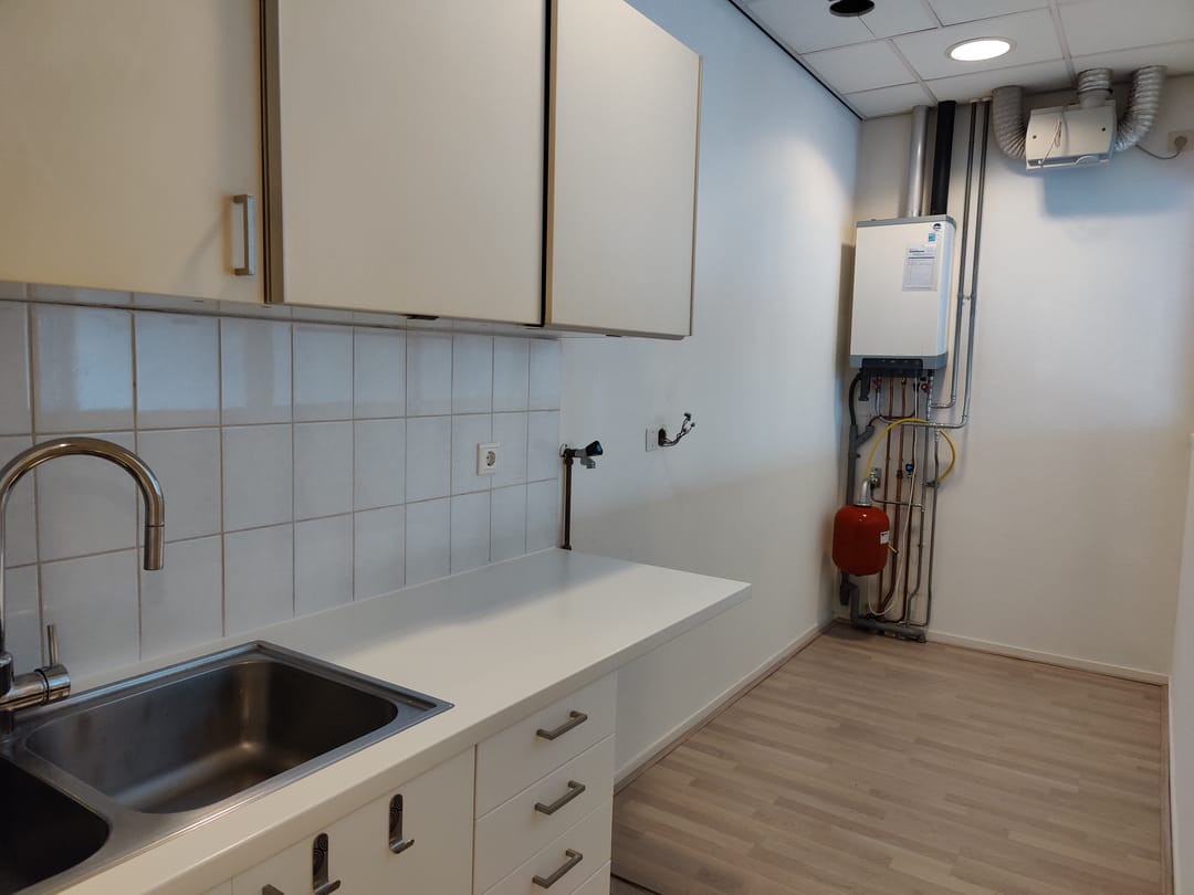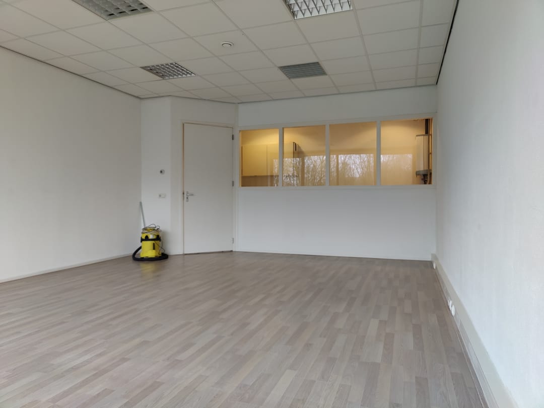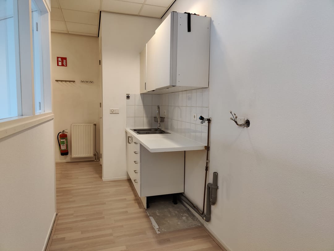 - Eerste verdieping: Overloop, toilet met fontein, keukenblokje met ook witgoed- en/of vaatwasseraansluiting, c.v.-opstelling en MVU. Kantoorruimte van circa 40 m2 met wit gespoten wanden, lichte laminaatvloer, systeemplafond met ingebouwde TL-armaturen, cv-radiatoren en kabelgoten.