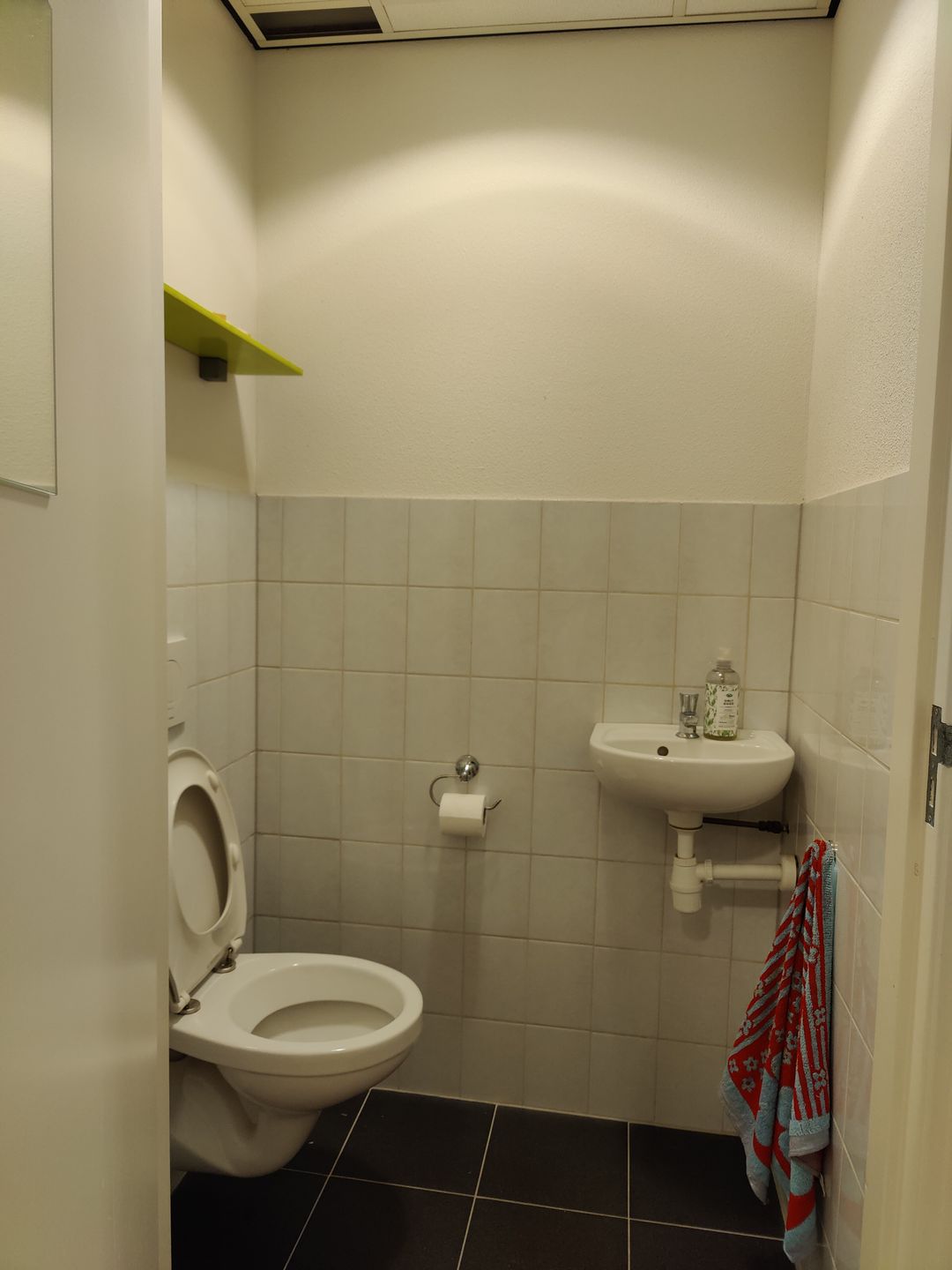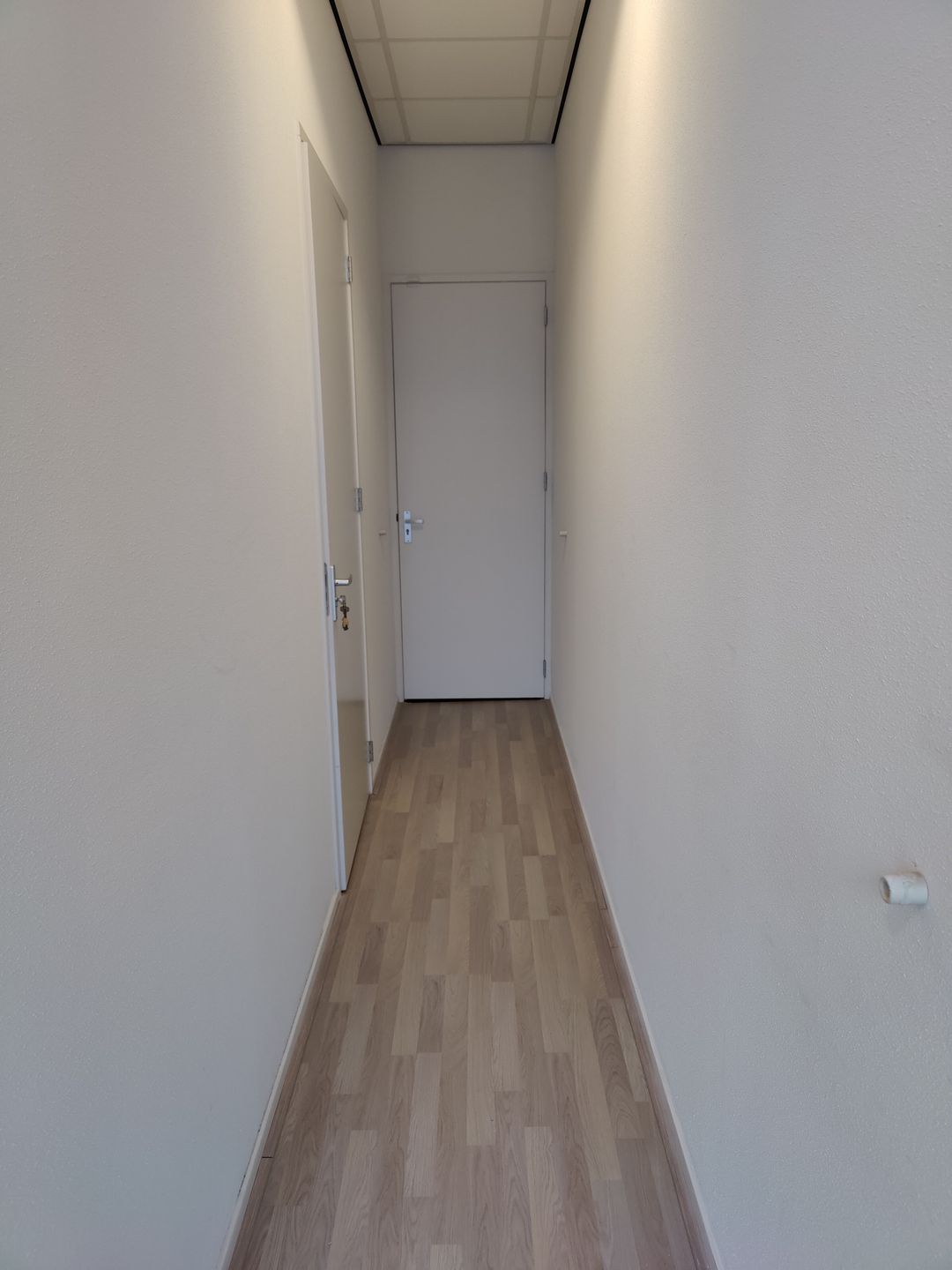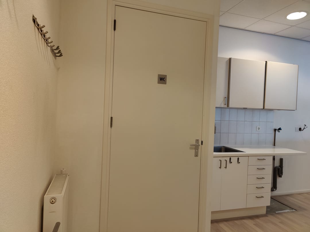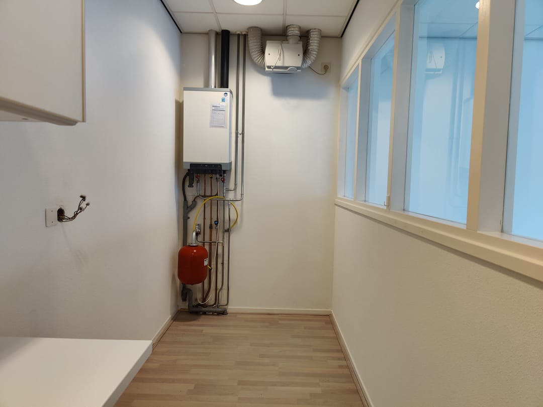 - Eerste verdieping: Overloop, toilet met fontein, keukenblokje met ook witgoed- en/of vaatwasseraansluiting, c.v.-opstelling en MVU. Kantoorruimte van circa 40 m2 met wit gespoten wanden, lichte laminaatvloer, systeemplafond met ingebouwde TL-armaturen, cv-radiatoren en kabelgoten.