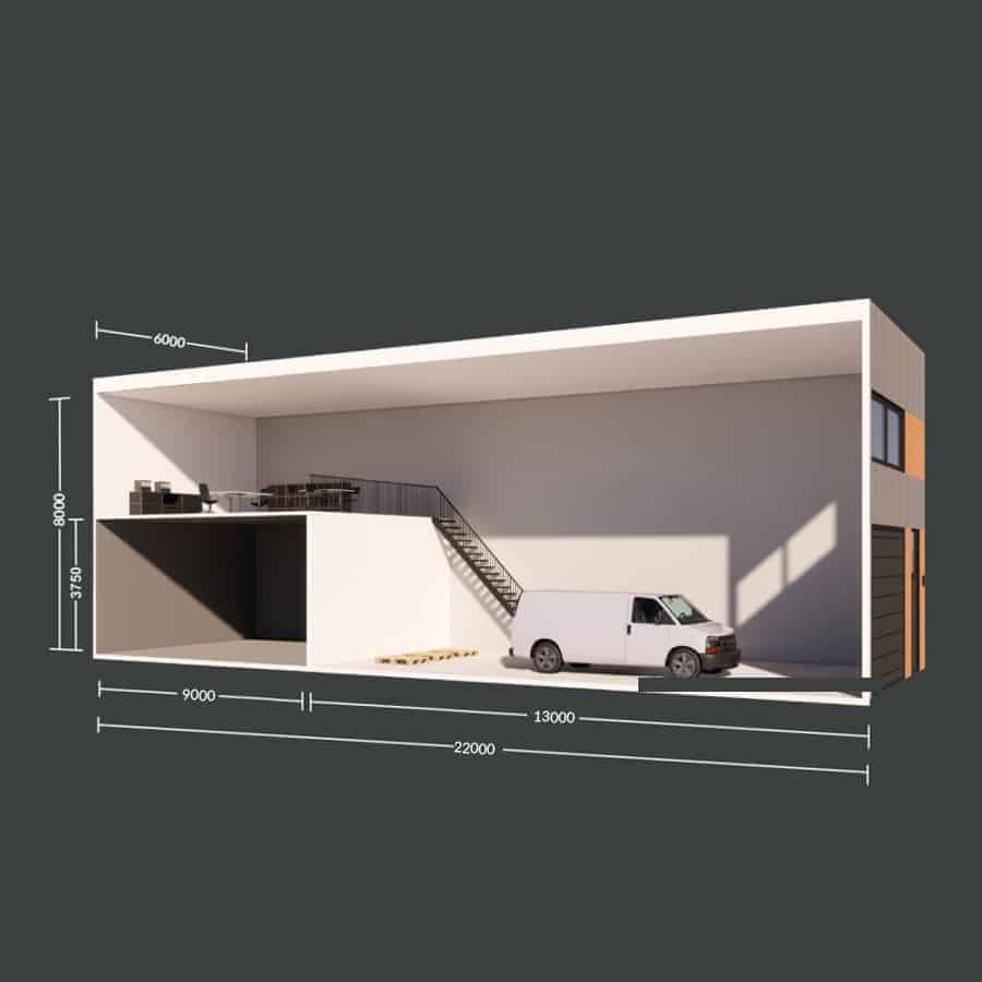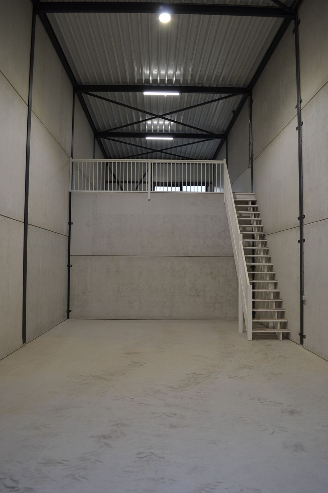 Het betreft een nieuw opgeleverde bedrijfsunit van totaal 132 m2, verdeeld over 78 m2 begane grond en 54 m2 verdieping met vaste trap. De begane grond heeft een vrije hoogte van ca. 7,5 meter. De unit is bereikbaar via de eigen voordeur of overhead-deur met een vrije doorgang van 3 meter breedte en ca. 3,5 meter hoogte.