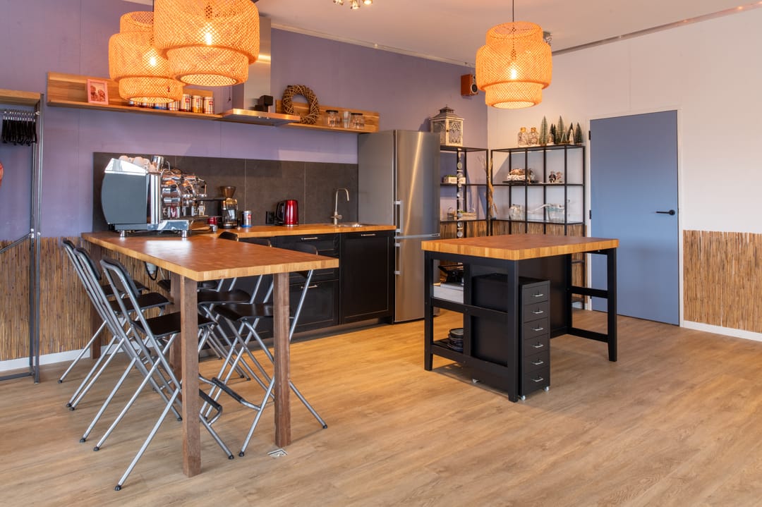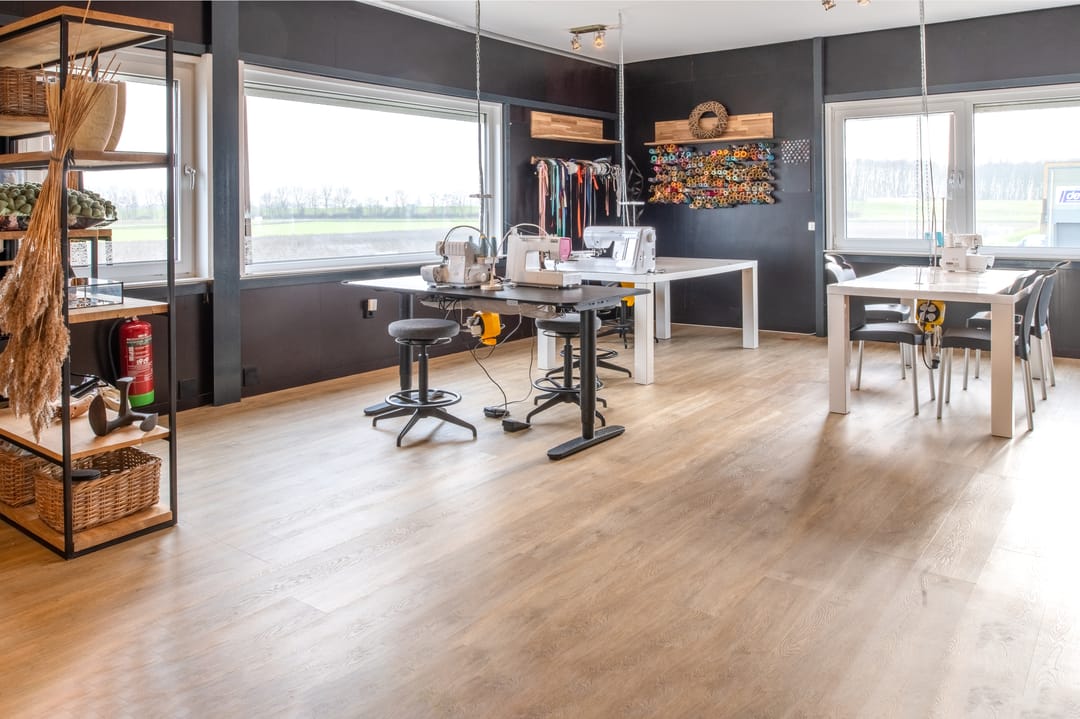 Bedrijfs/kantoorruimte (oppervlakte 68,4m2) met stalen constructie en houten vloer afgewerkt met een houtlook pvc vloer, grote raampartij aan voor- en zijkant met kunststof kozijnen en HR-glas en elektrische sunscreens aan de buitenzijde. Voorzien van keukenblok met inbouwapparatuur (vaatwasser), afzuigkap, spoelunit en grote koelkast, twee toiletruimtes (heren en dames), grote airconditioningsunit voor verwarming en koeling van de volledige verdieping. Tevens is er een centrale geluidsinstallatie met geluidsboxen door het hele pand aanwezig.