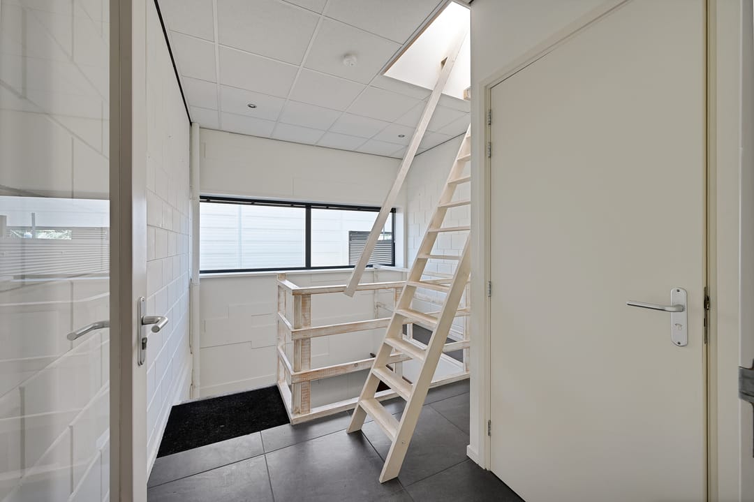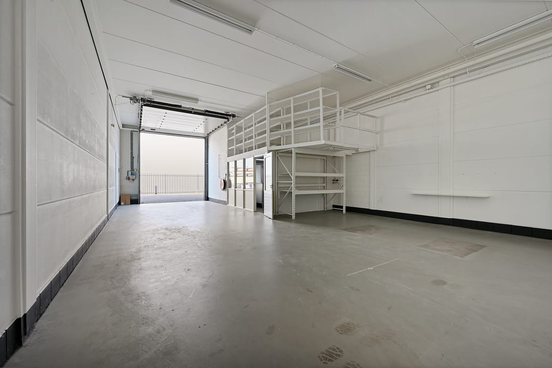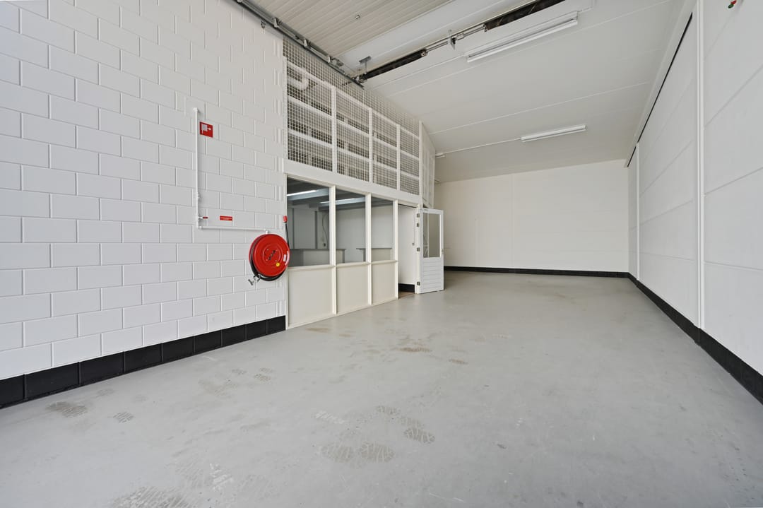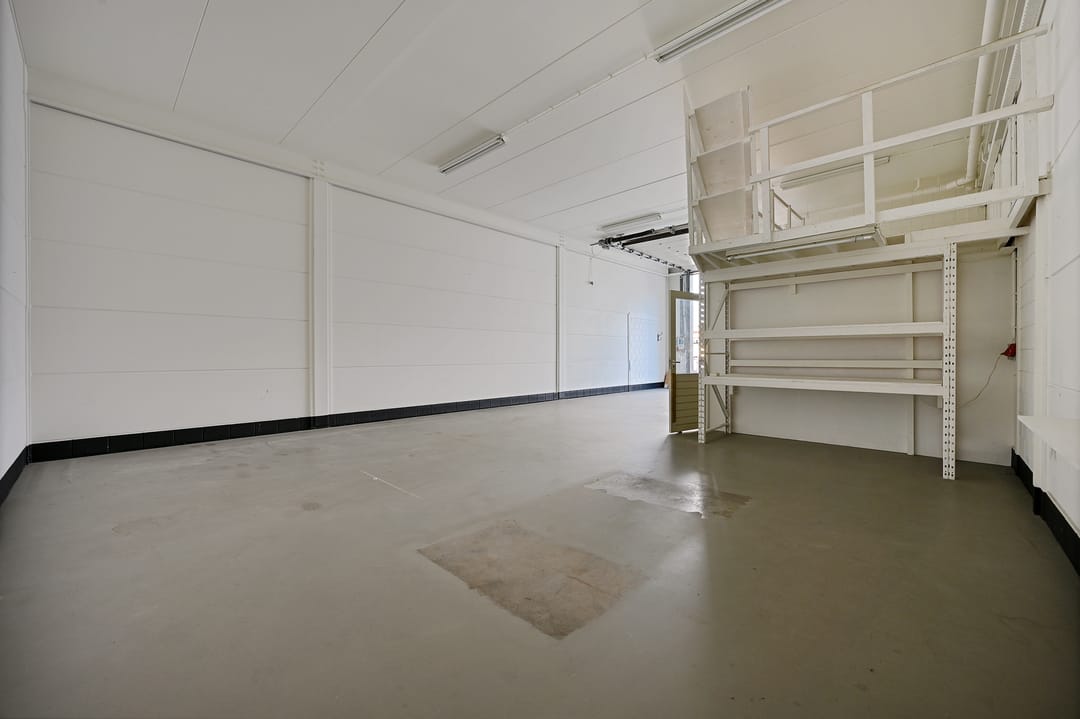 Bij binnenkomst treft u een hal met trapopgang, toilet en meterkast. Vanuit de hal bereikt u een separate kantoor- of ontvangstruimte van circa 12 m². Vervolgens komt u in de ruime loods met betonnen vloer en elektrische overheaddeur. De loods heeft een vrije hoogte van circa 4,3 meter, een oppervlakte van circa 117 m² en een diepte van circa 15 meter. Tevens is de ruimte voorzien van diverse praktische faciliteiten, waaronder betonnen vloeren, lichtstraten, een brandslang en een kleine vide (trap nog te realiseren) die extra opslagmogelijkheden biedt.