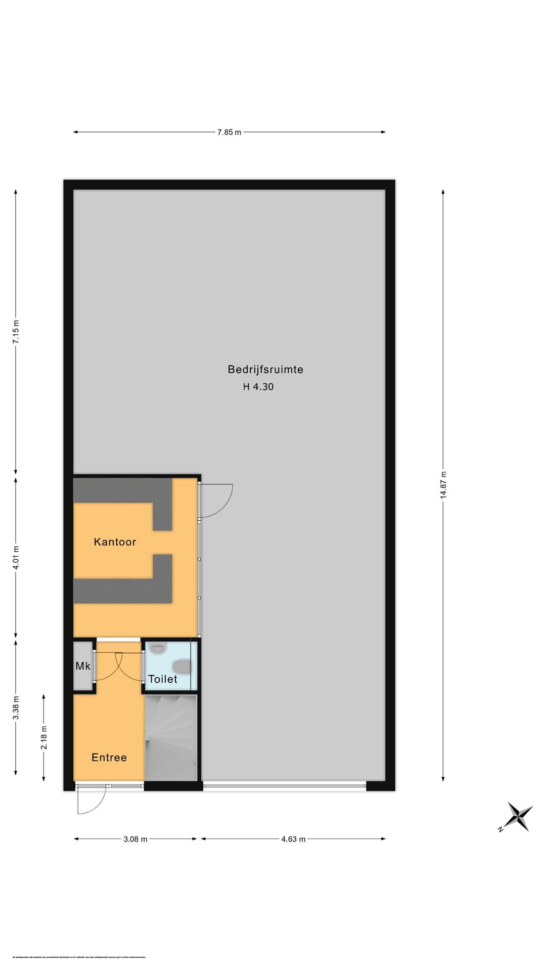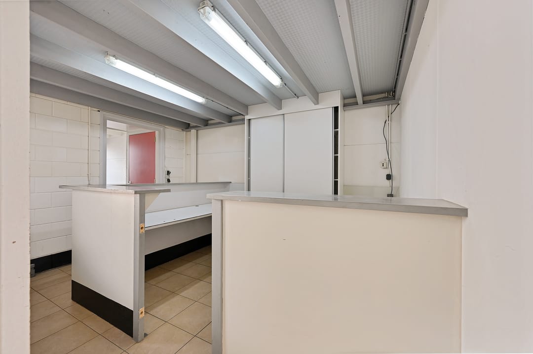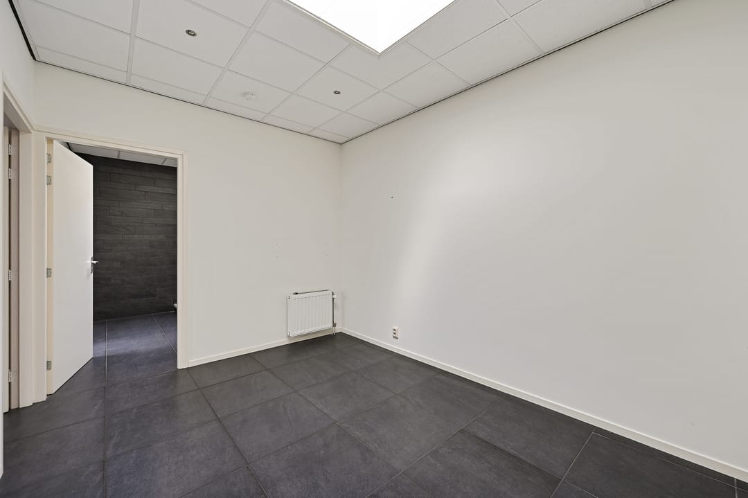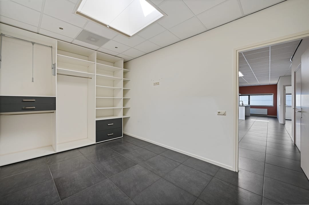 Bij binnenkomst treft u een hal met trapopgang, toilet en meterkast. Vanuit de hal bereikt u een separate kantoor- of ontvangstruimte van circa 12 m². Vervolgens komt u in de ruime loods met betonnen vloer en elektrische overheaddeur. De loods heeft een vrije hoogte van circa 4,3 meter, een oppervlakte van circa 117 m² en een diepte van circa 15 meter. Tevens is de ruimte voorzien van diverse praktische faciliteiten, waaronder betonnen vloeren, lichtstraten, een brandslang en een kleine vide (trap nog te realiseren) die extra opslagmogelijkheden biedt.