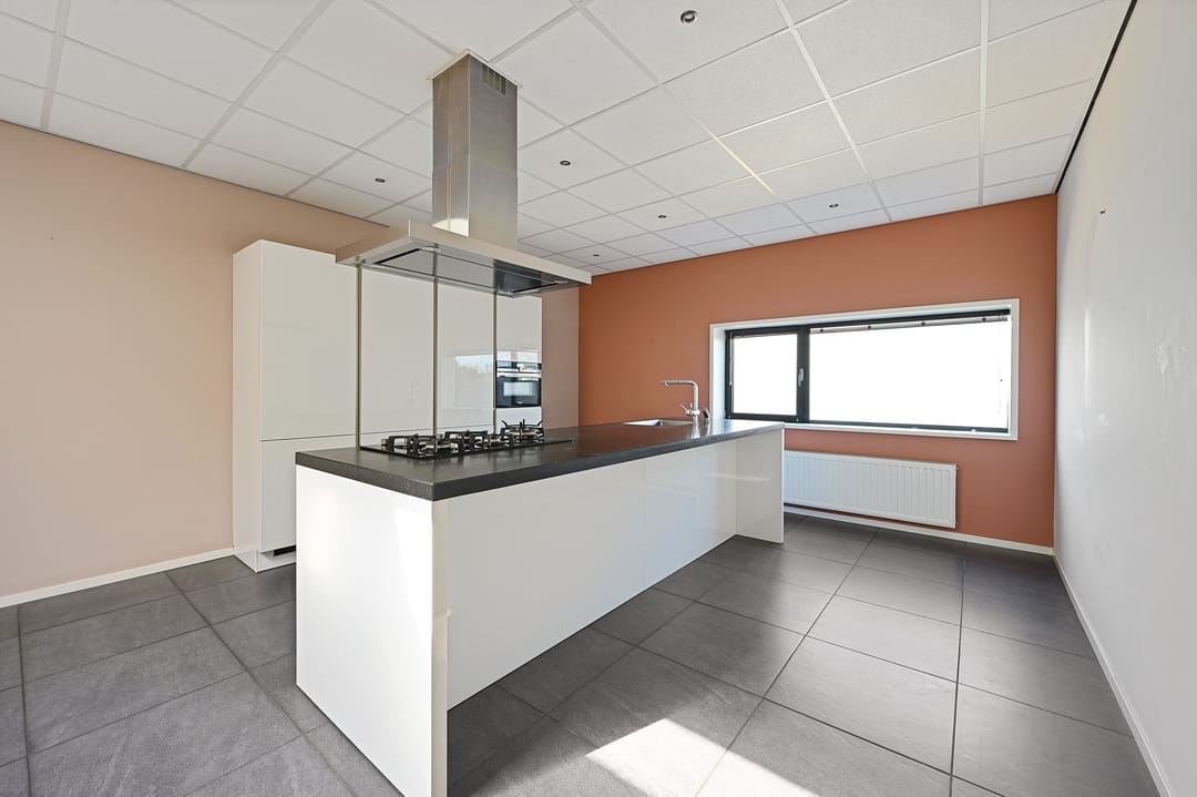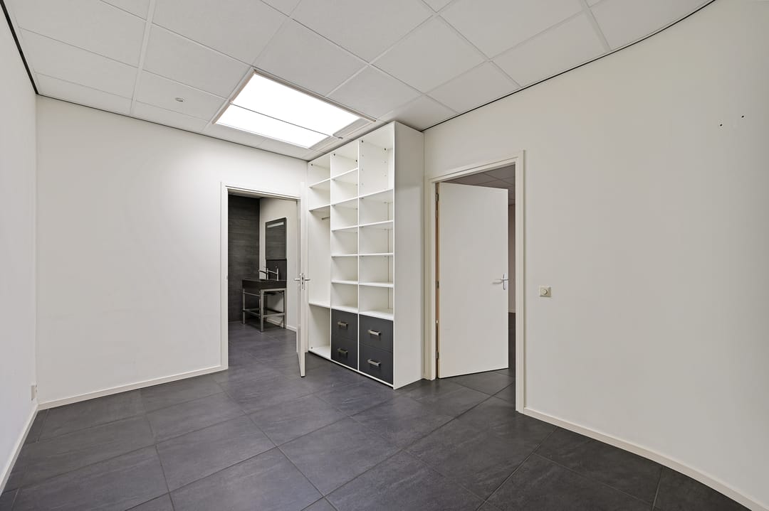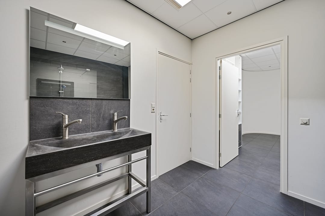 Op de verdieping bevindt zich een royale kantoorruimte met een moderne, luxe hoogglans keuken voorzien van diverse inbouwapparatuur, waaronder een vaatwasser, gaskookplaat en combi-magnetron. Er is ook een warmwaterkraan beschikbaar. Ideaal voor een gezellige lunch of bedrijfsborrel. Verder zijn er op deze etage nog twee extra kantoorruimtes aanwezig, evenals een luxe badkamer met inloopdouche en dubbele wastafel. Op de gang is een separaat toilet gesitueerd, met daarnaast een trap naar het dak. Voor het comfort is de verdieping uitgerust met vloerverwarming, airconditioning en ook nog een wasmachine-aansluiting. Dankzij meerdere dakramen is er in iedere ruimte volop daglicht.