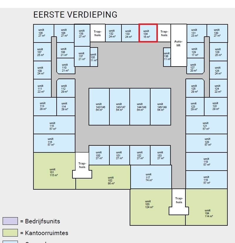Unit 134 is een representatieve en praktisch ingedeelde unit gelegen op de eerste verdieping. Dankzij de ligging direct bij de A20 is de bereikbaarheid uitstekend. Het terrein is ruim opgezet met brede rijwegen en voldoende parkeervoorzieningen op eigen terrein, ideaal voor ondernemers die efficiënt willen werken.