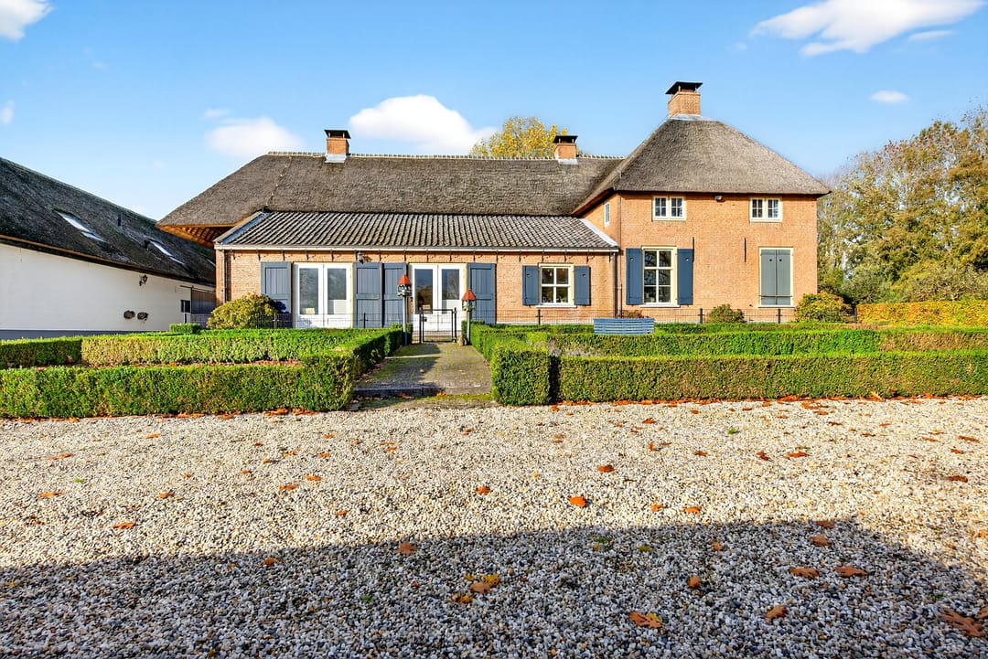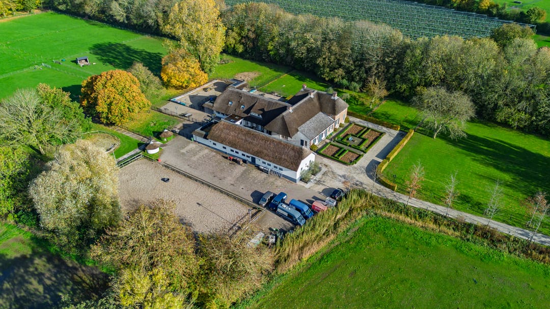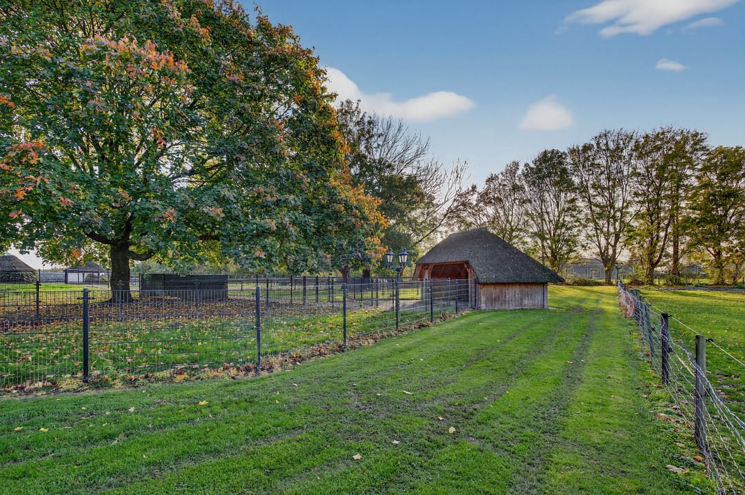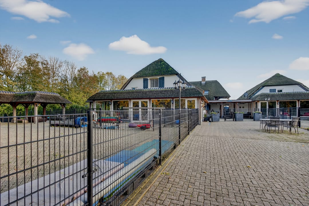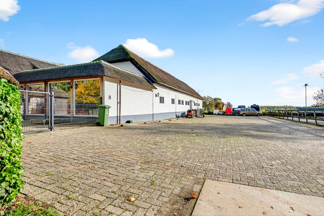 Het royale bijgebouw is tevens met riet gedekt en op de begane grond voorzien van drie paardenboxen, een grote serre en een grote kantoorruimten en een keuken.