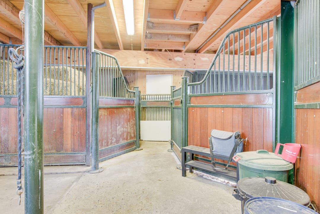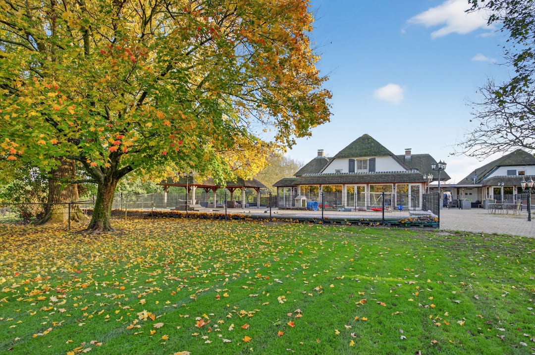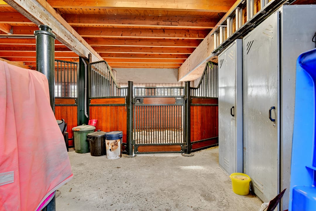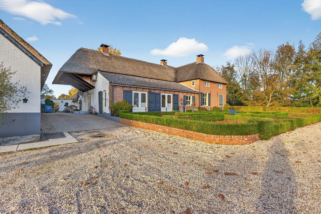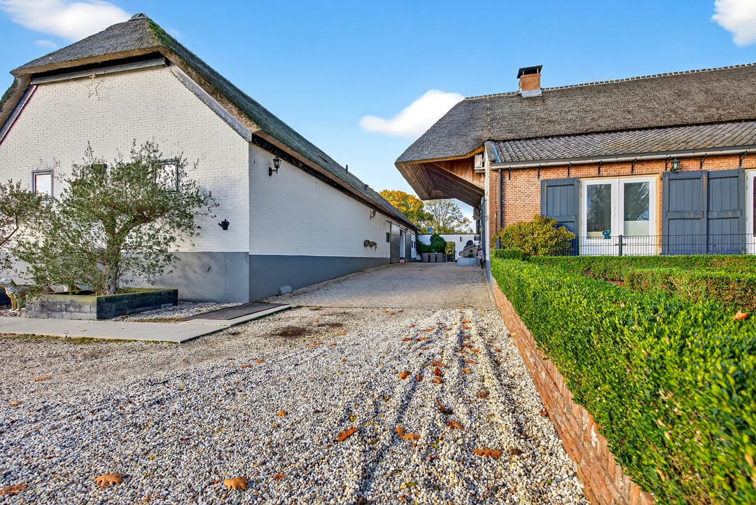 Het royale bijgebouw is tevens met riet gedekt en op de begane grond voorzien van drie paardenboxen, een grote serre en een grote kantoorruimten en een keuken.