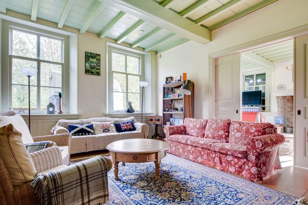 De woonkamer bevindt zich in de originele woning aan de voorzijde en is een gezellige, ruime kamer met uitslaande deuren. Aansluitend is de tweede woonkamer met de royaal opgezette keuken met uitzicht op groen. Via de keuken is de derde en vierde woonkamer bereikbaar met een sfeervolle open haard. Ook vanuit deze ruimten is er een mooi zicht op de tuin rondom de woning.
