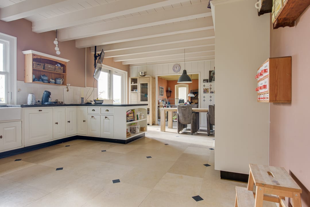 De landelijke keuken is aan de voorzijde gelegen en is in een hoek geplaatst en beschikt over diverse inbouwapparatuur, waaronder een landelijke oven (merk AGA) met schouw, vaatwasser, dubbele spoelbak en is zeer ruim opgezet. De authentieke balken in het zicht zorgen voor een aangename sfeer.