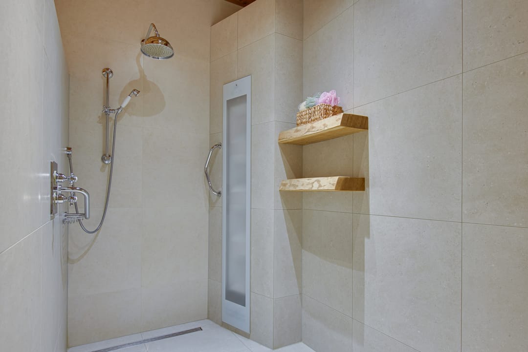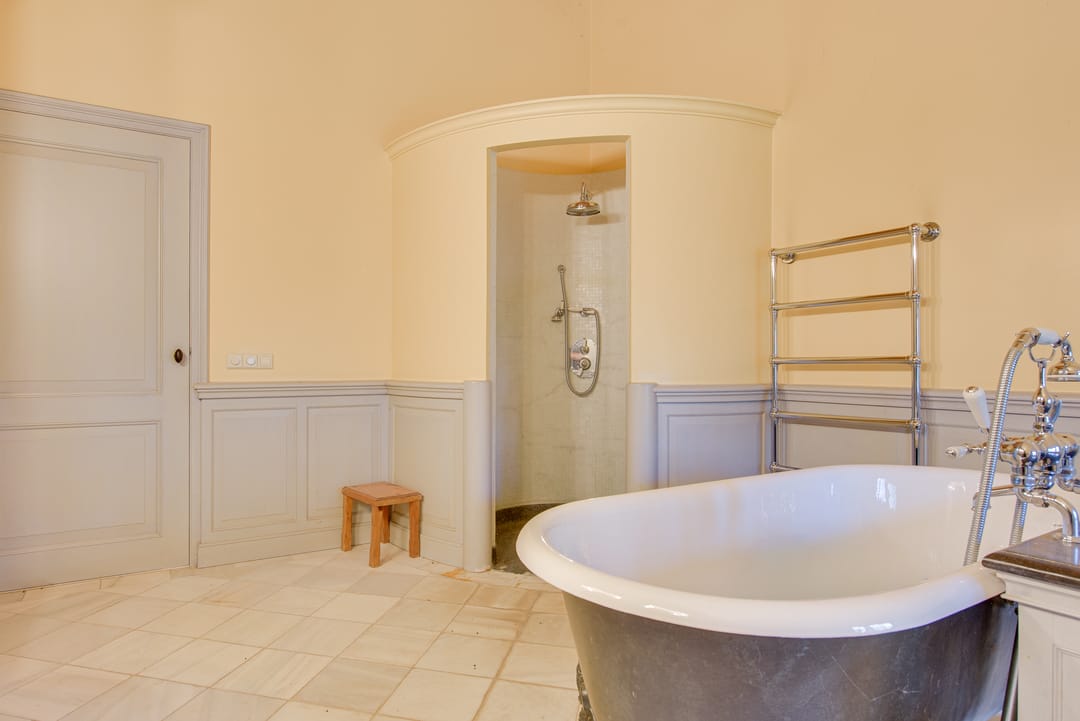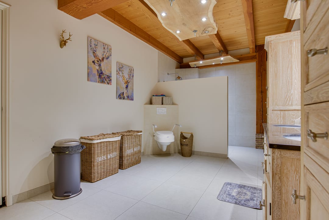 De slaapkamer op de begane grond is zeer royaal en heeft zicht op de tuin. Verder is hier ook de badkamer met inloopdouche, dubbele wastafel en toilet. Ook de badkamer op de begane grond is zeer royaal opgezet. Hier zijn de aansluitingen voor de was- en droogapparatuur.
