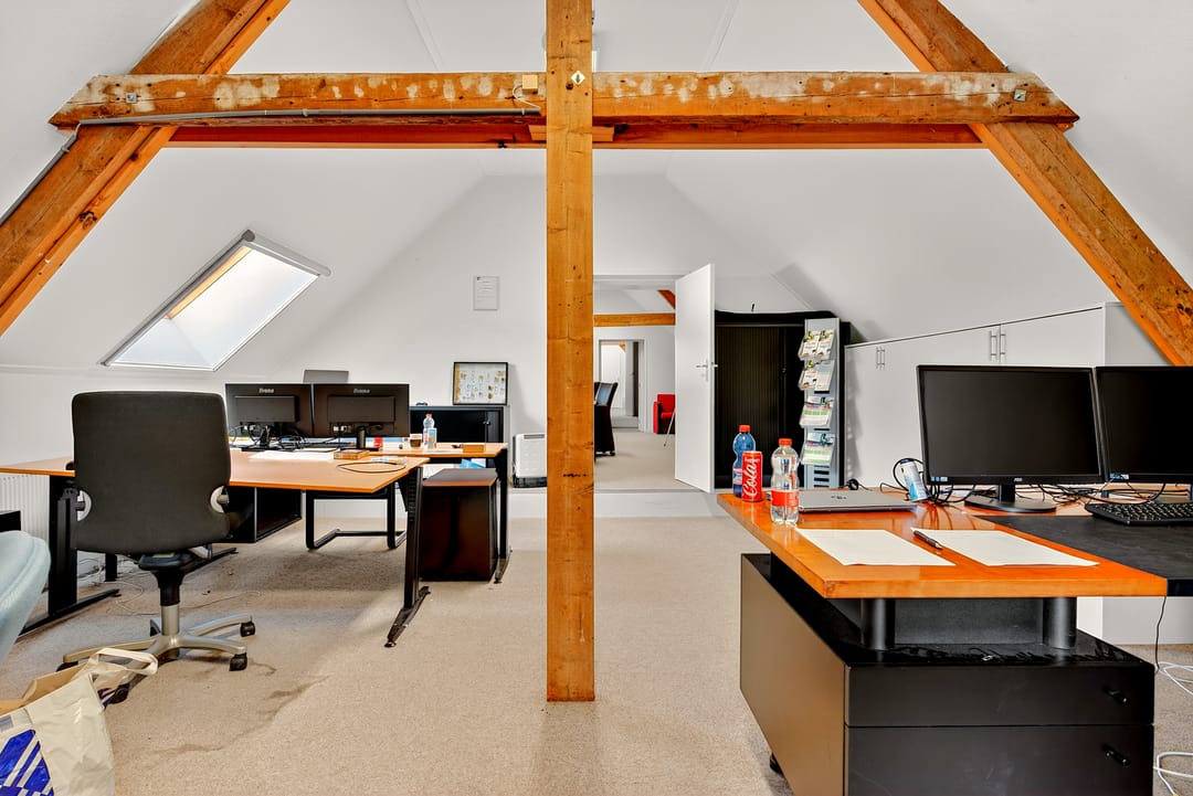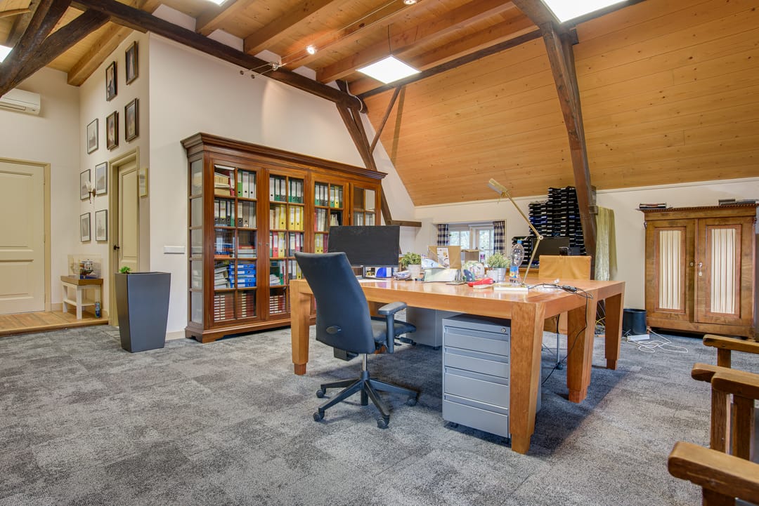 Ruime overloop met toegang naar alle ruimtes op deze verdieping. Er bevinden zich hier drie, momenteel als kantoor ingerichte ruimten. Waarvan twee ruimten met een badkamer.