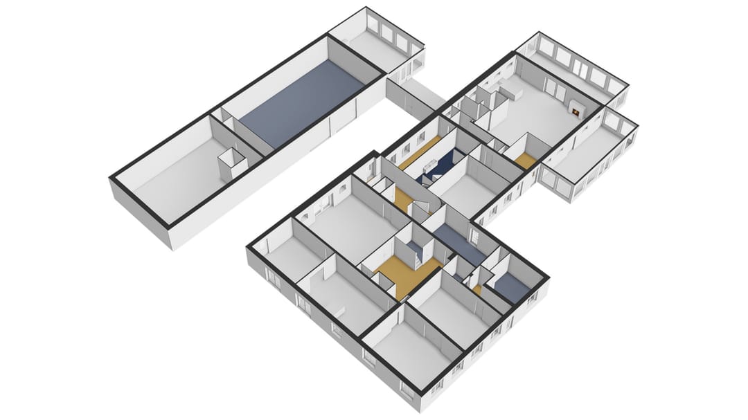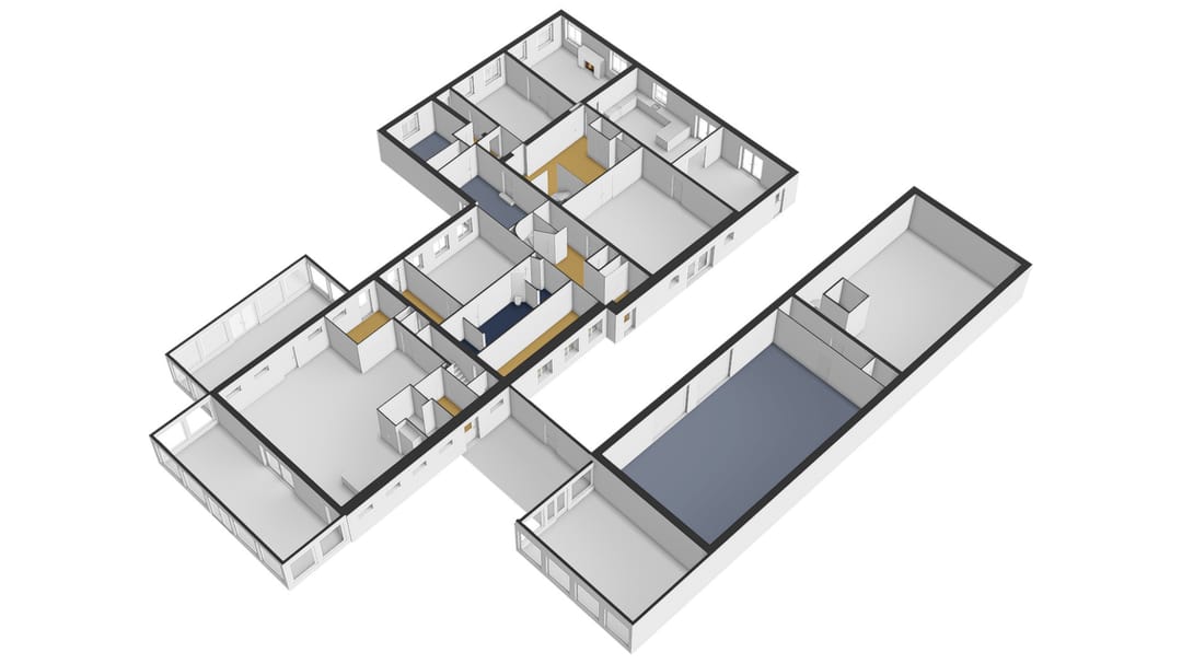 Aansluitend is het portaal met een grote inloopkast, slaapkamer en badkamer. Ook vanuit deze ruimte is het achterhuis met de serres bereikbaar.