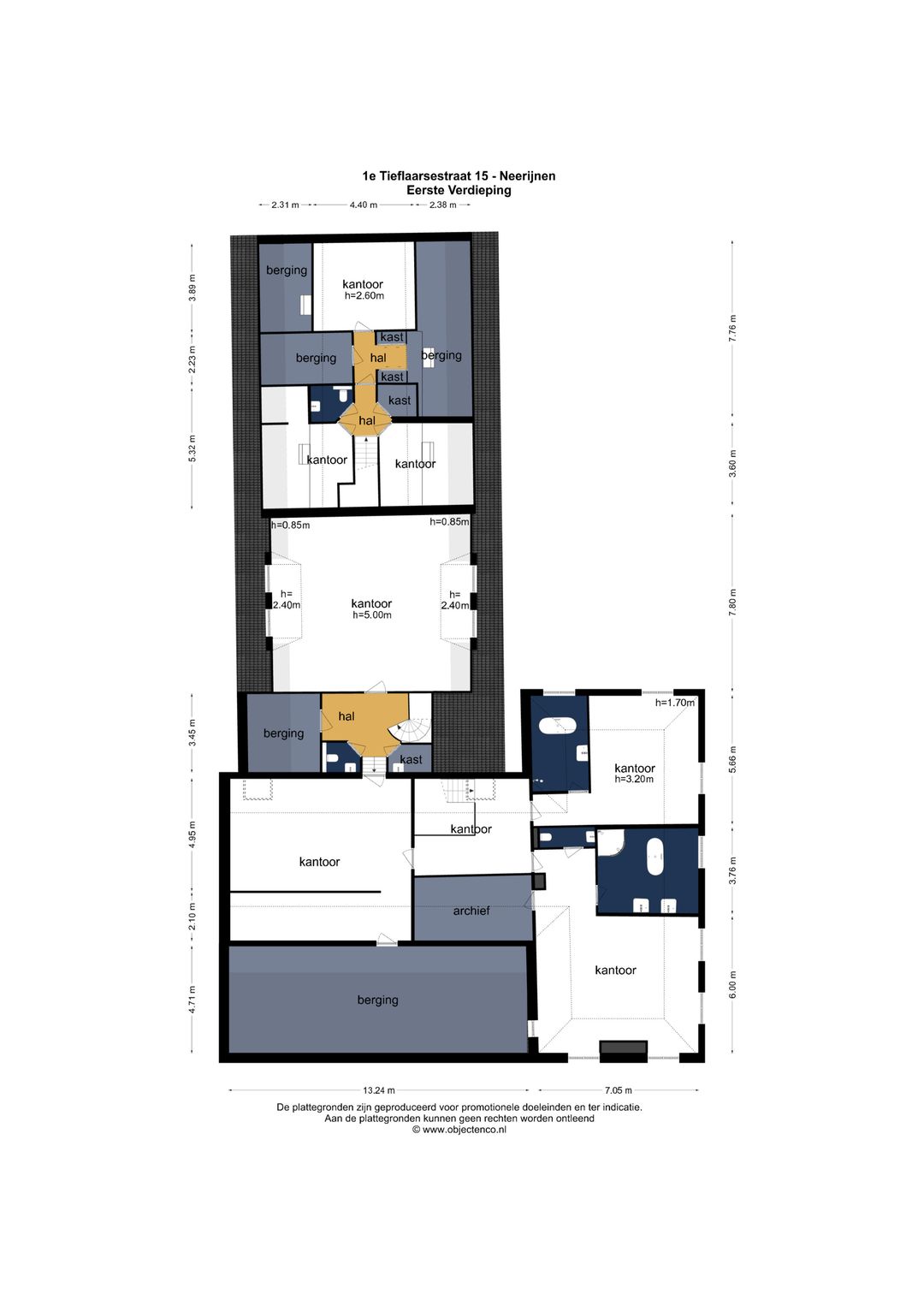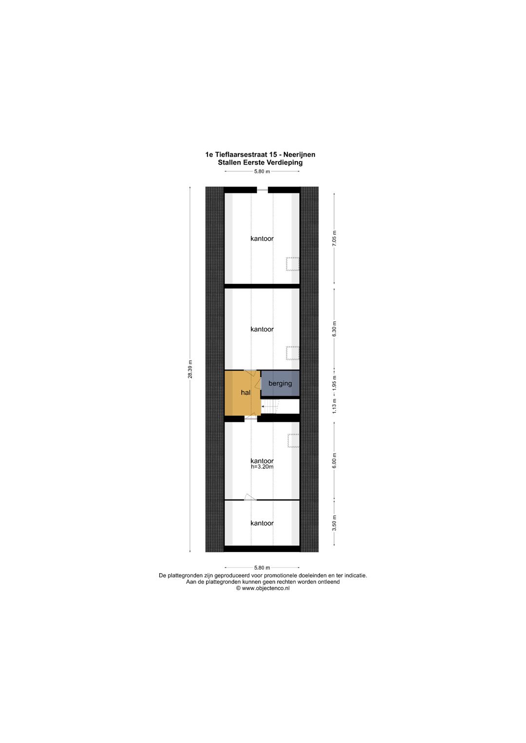 Op de eerste verdieping bevinden zich twee toiletruimten, kastruimten, vier kantoorruimten met vier grote bergingen.