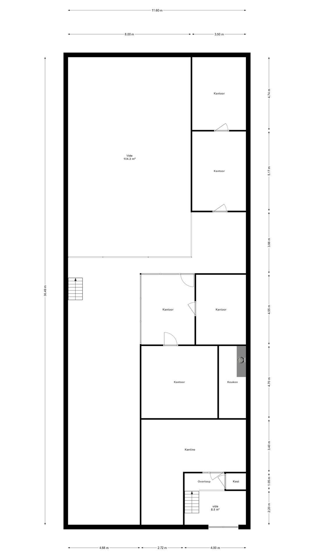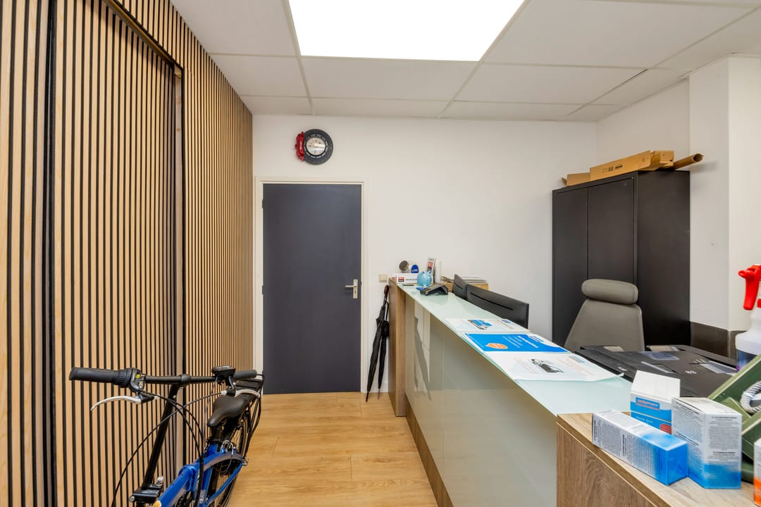The commercial space features a wide access overhead door with ample clearance and a separate independent common entrance for accessibility to the ground floor and first floor office areas. At the front, various office spaces are located on both the ground floor and the first floor. This commercial/office property, currently comprising approximately 645 m² of Gross Floor Area (BVO) and around 593 m² of Rentable Floor Area (VVO), is extremely attractive due to its flexibility in usage. Separate parking spaces at the front on its own premises are included, with a total land area of approximately 572 m².