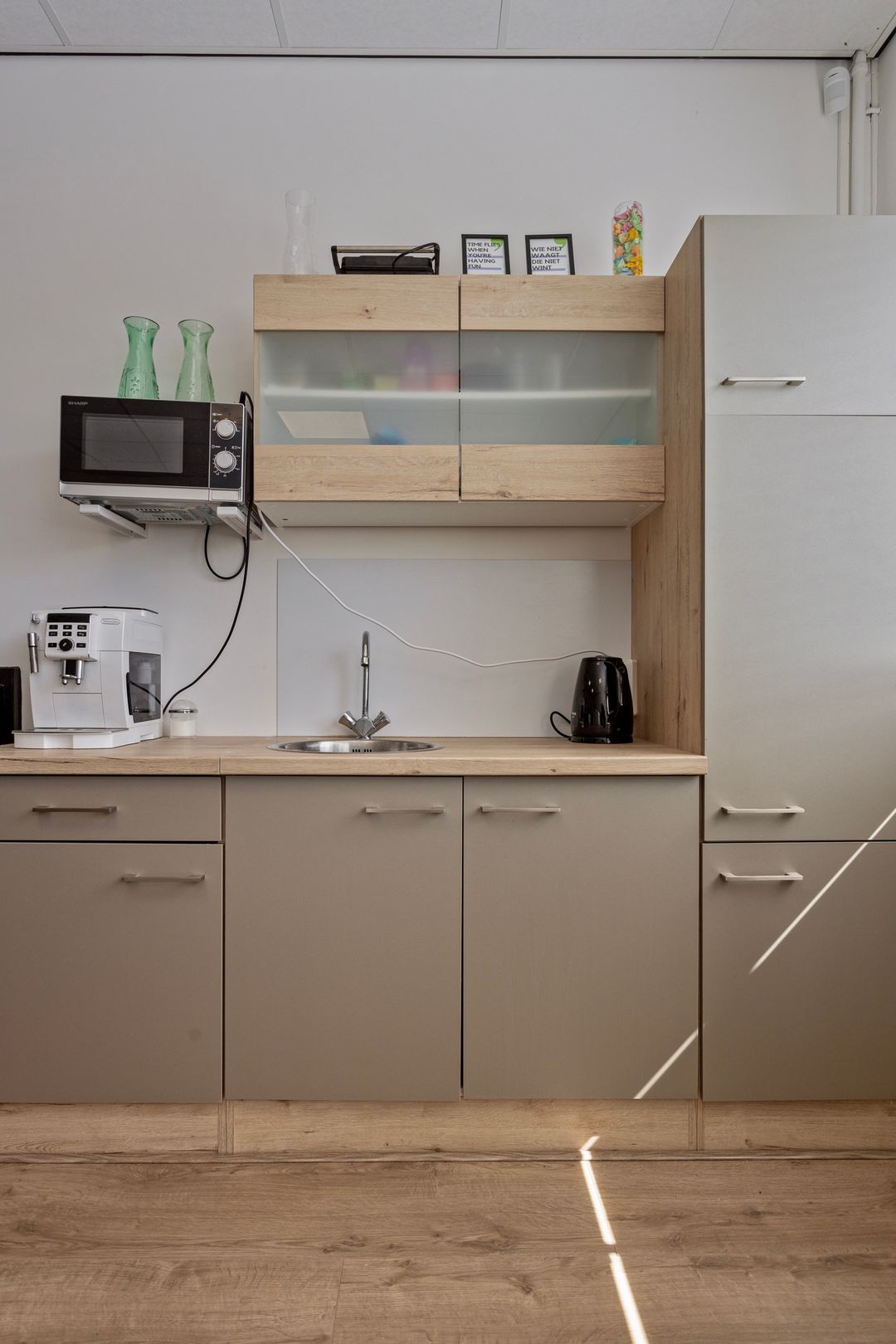 - keukenblok met gootsteen in de kantoorruimte;