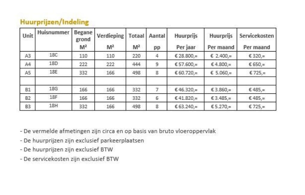 Elke bedrijfsunit beschikt over eigen parkeerplaatsen. De huurprijs per parkeerplaats bedraagt € 500,= per plaats per jaar exclusief BTW.