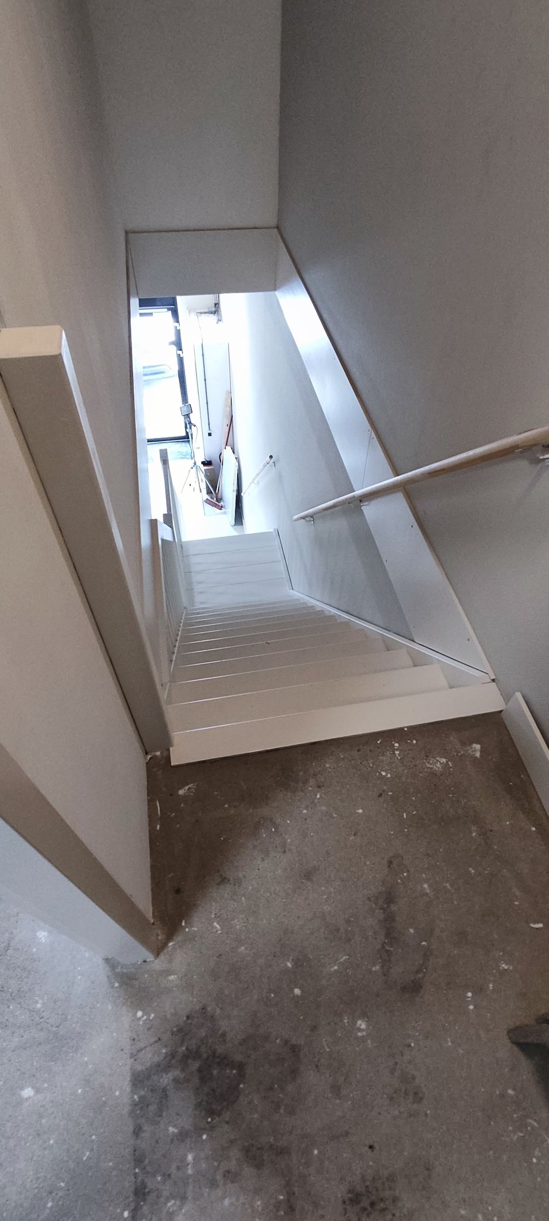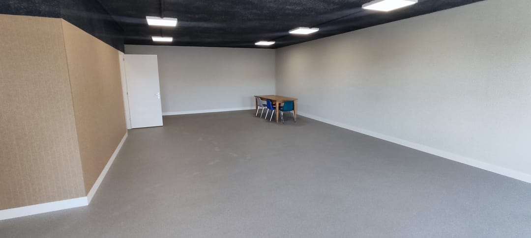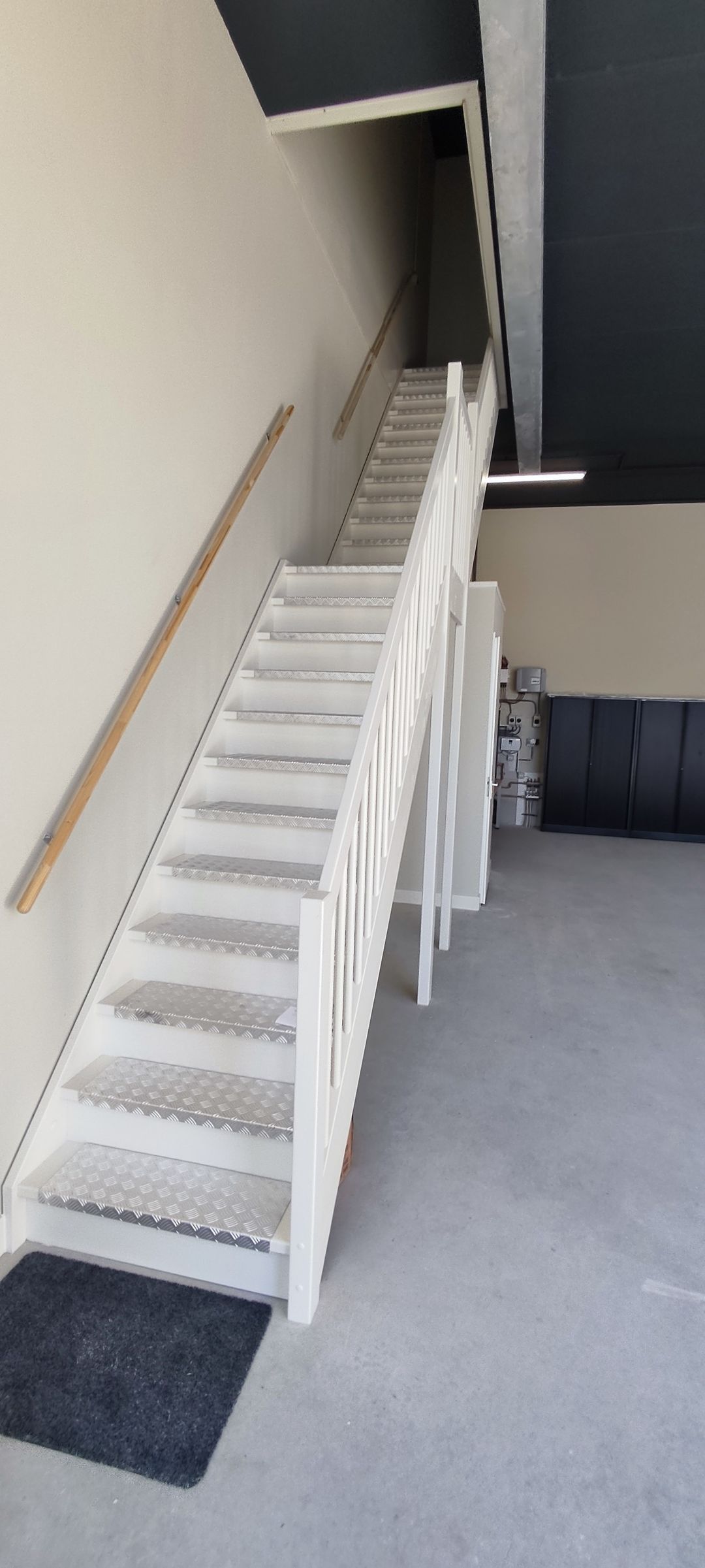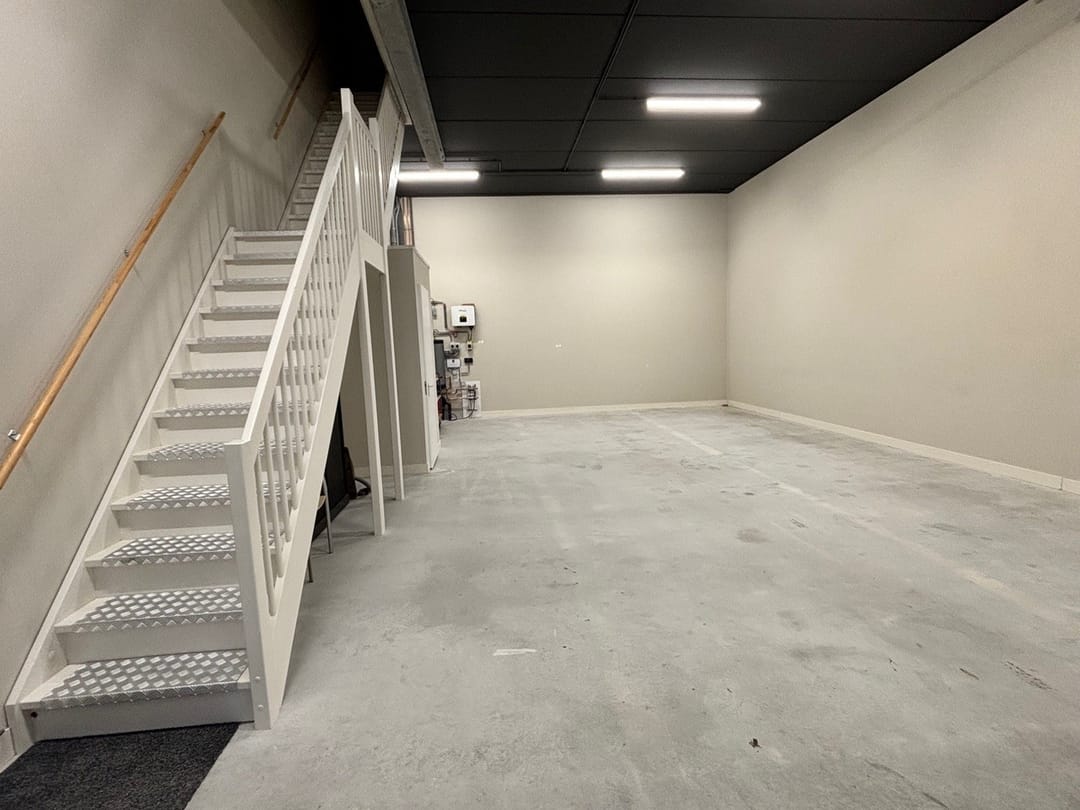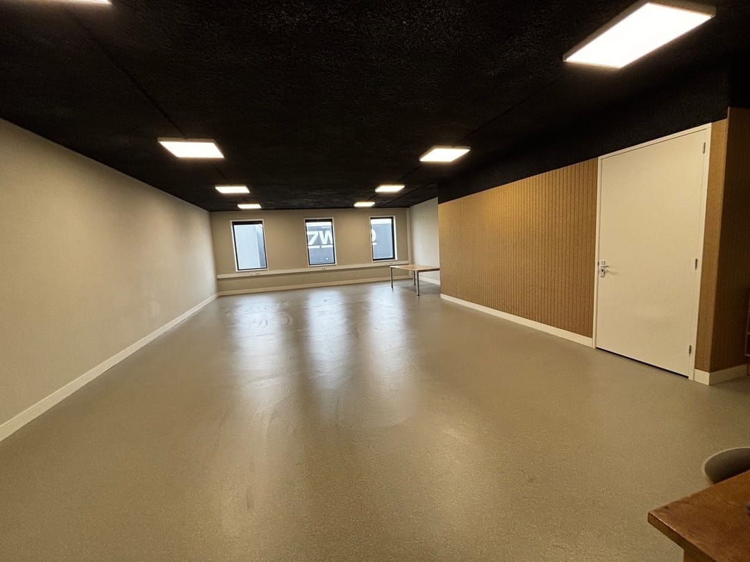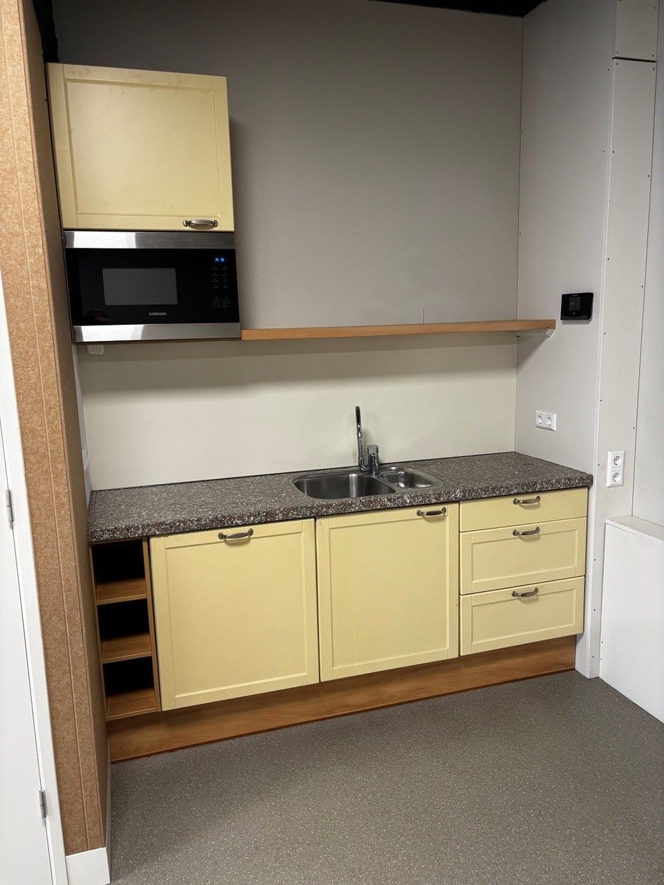 The internal staircase leads to the upper floor. This space contains a kitchen with a dishwasher and microwave and can be used as office space. The floor has vinyl flooring and a modern anthracite acoustic ceiling with LED lighting. There are also sufficient wall sockets and data points.