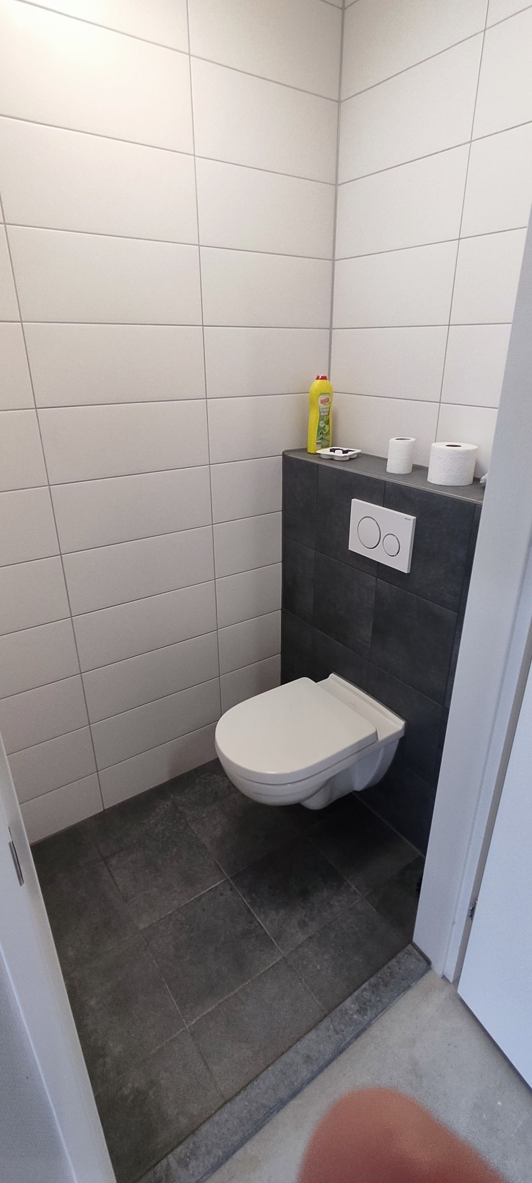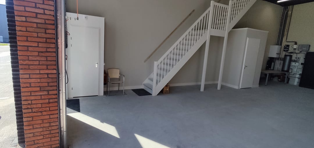 The ground floor has a monolithically finished liquid-tight concrete floor with a maximum load of 1,500 kg/m2. The space is equipped with LED lighting. There is also a sink, a meter cupboard with electricity, water, and fiber optics, and a neat toilet area.