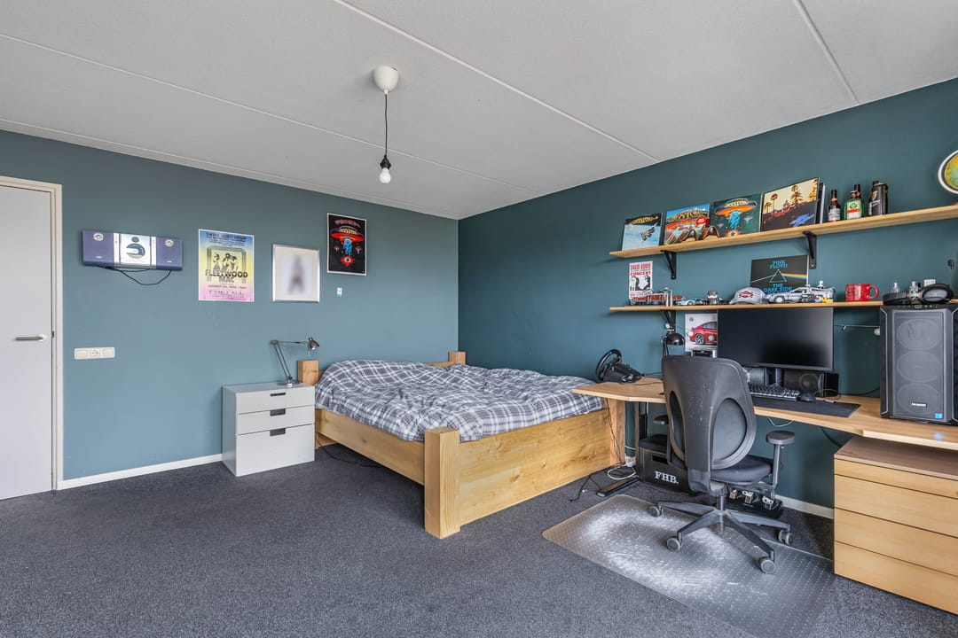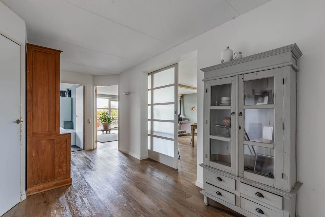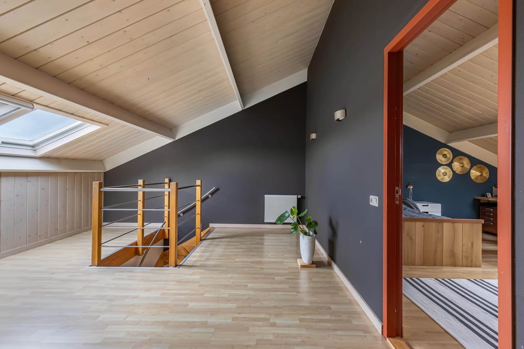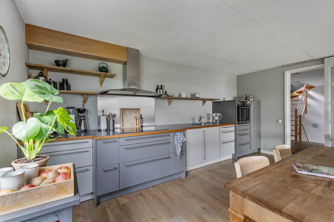 Overloop, berging met witgoedvoorzieningen en deur naar de verdieping van de bedrijfshal. Toilet met fontein, 3 slaapkamers, badkamer voorzien van dubbele wastafel, ligbad en douchecabine. Ruime woonkamer met houtkachel, toegang tot het ruime balkon, moderne keuken met inbouwapparatuur zoals: inductiekookplaat met afzuigkap, oven, vaatwasser en koelkast.