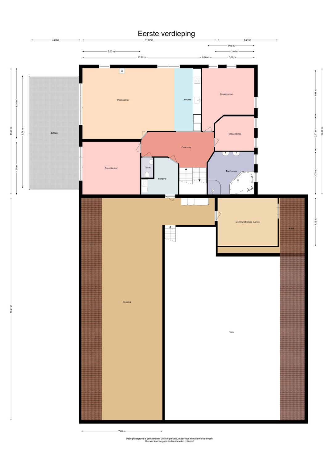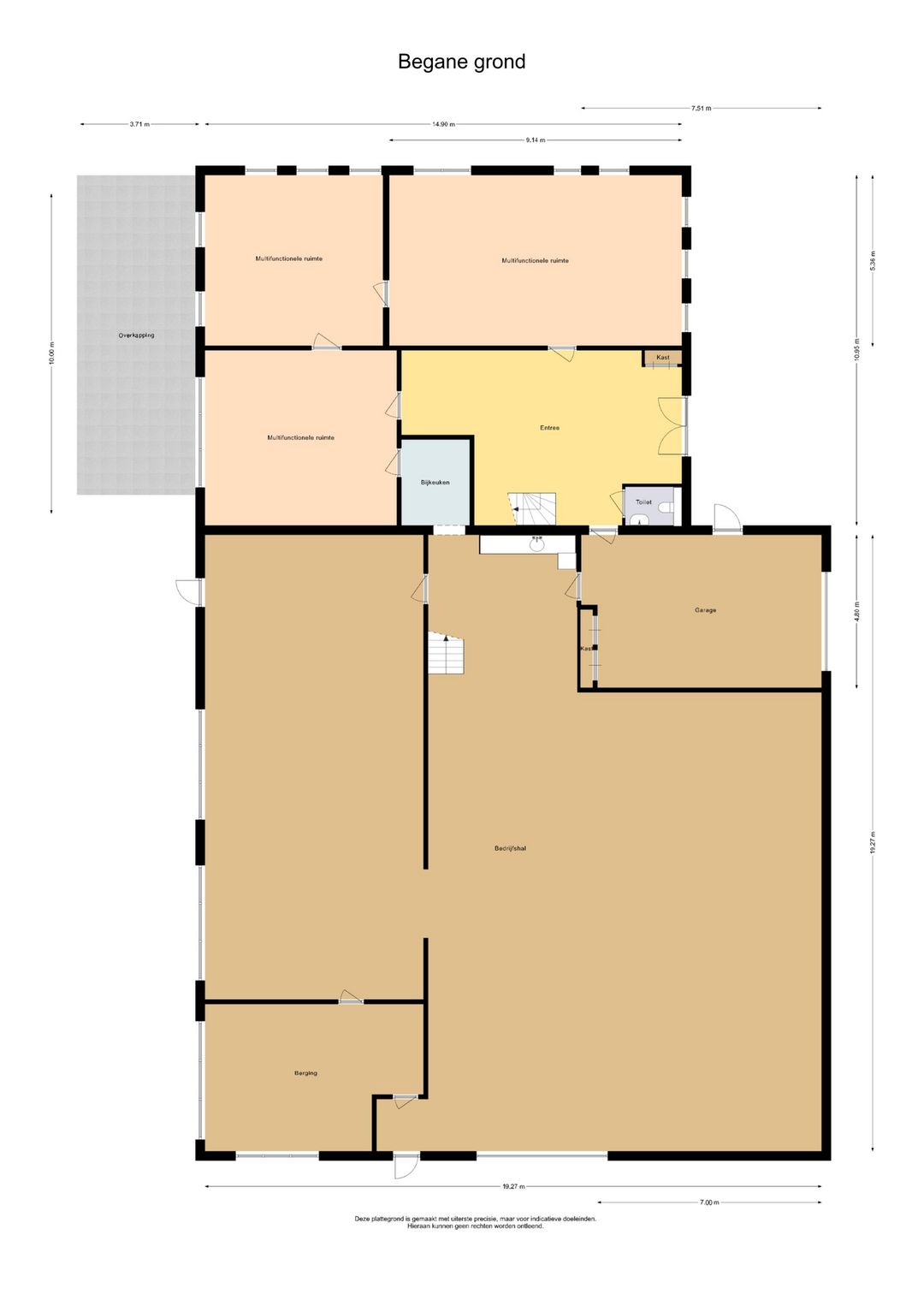 Entree/hal, toilet, trapopgang, meterkast. 3 multifunctionele ruimtes, bijkeuken, garage, ruime bedrijfshal met keukenblok en trap naar de verdieping.