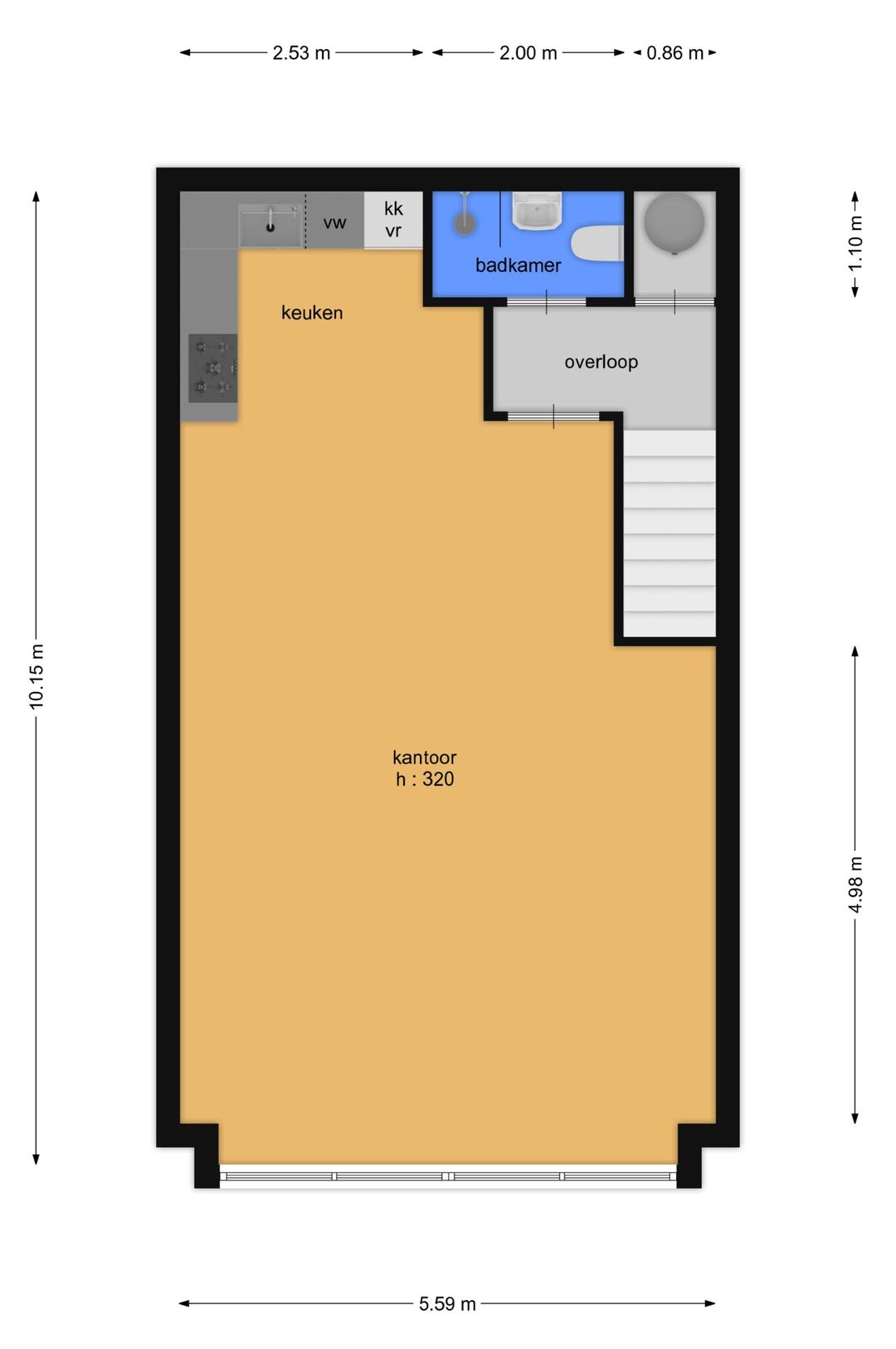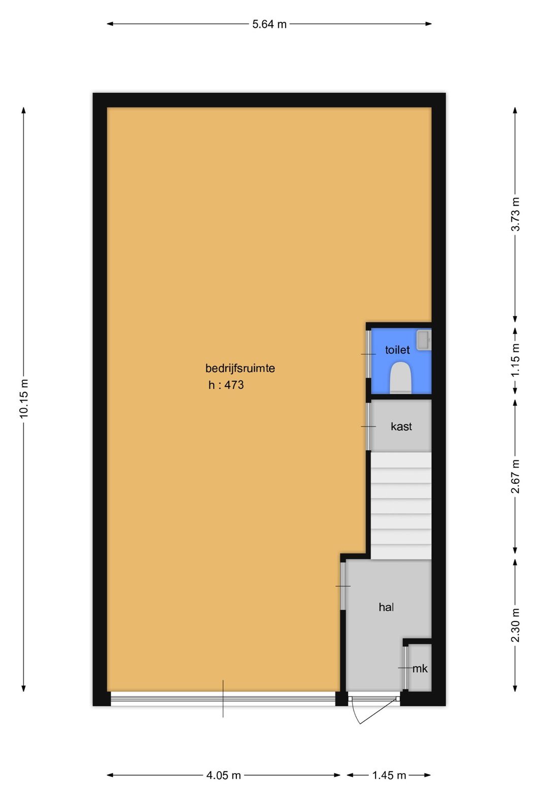 De begane grond bestaat uit een hal aan de rechtervoorzijde met meterkast en toegang tot de open bedrijfsruimte. Aan de rechterzijde liggen een toilet, een kast en een pantry. Op de verdieping komt de trap uit op een overloop met aan de voorzijde een badkamer. De rest van de verdieping is ingericht als open kantoorruimte met een keukenblok aan de linkerkant.