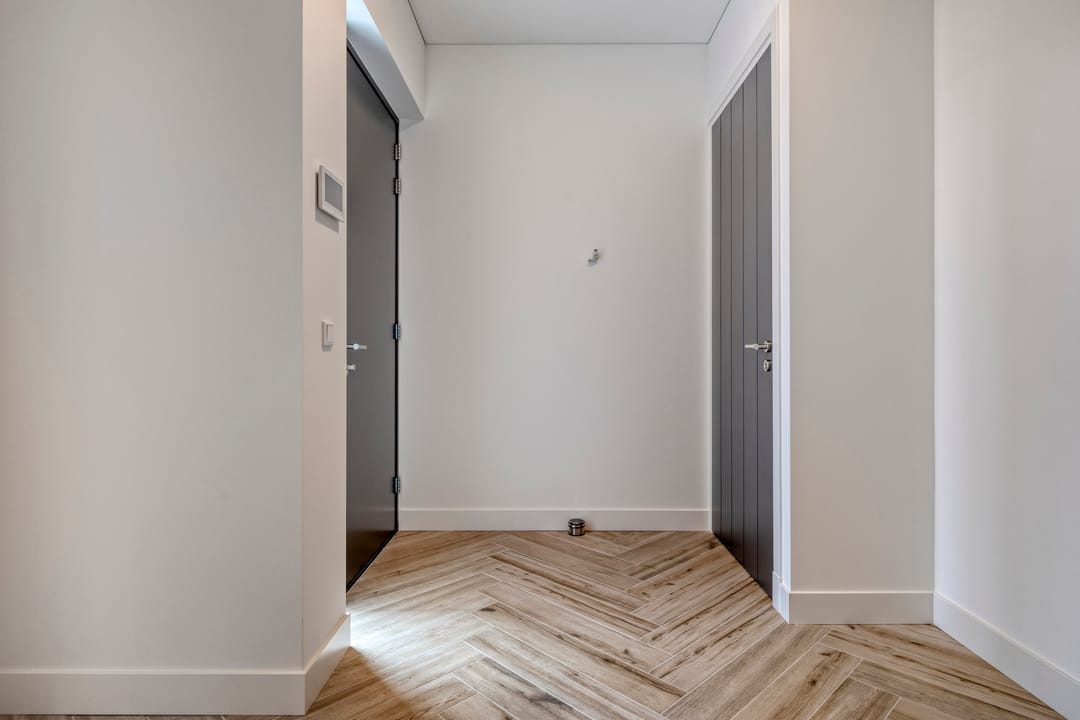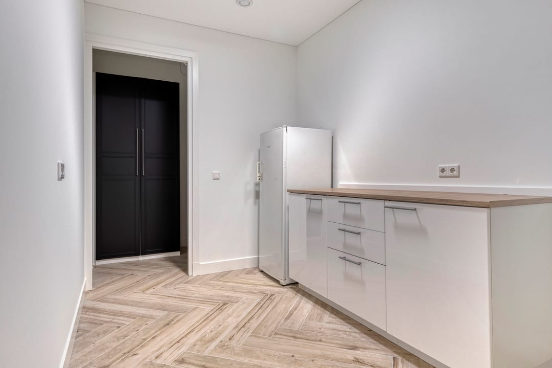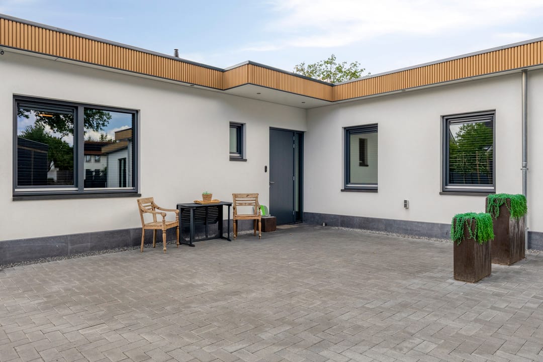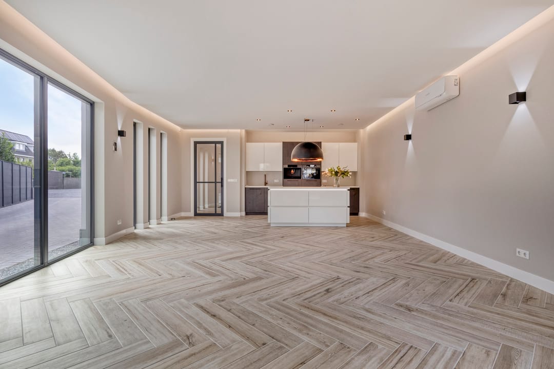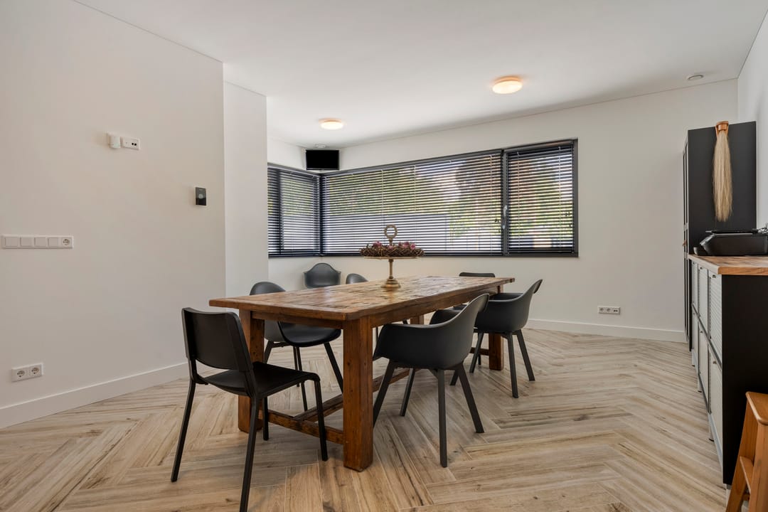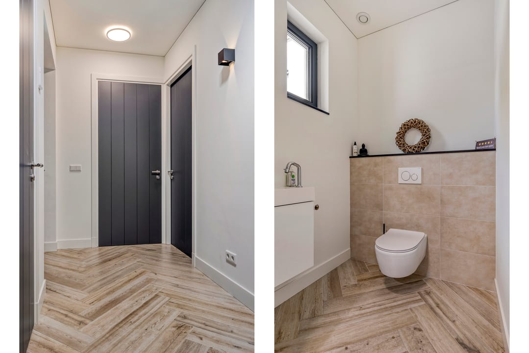 Binnen laat ook de afwerking niet te wensen over. Hoge plinten, inbouwspots, strak stucwerk en extra brede stompe houten deuren vormen een prachtig geheel met onder andere de houtlook plavuizenvloer en het neutrale kleurgebruik. De woning is geheel voorzien van vloerverwarming en voorzien van mechanische afzuiging.