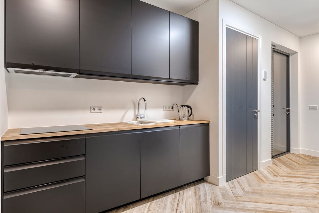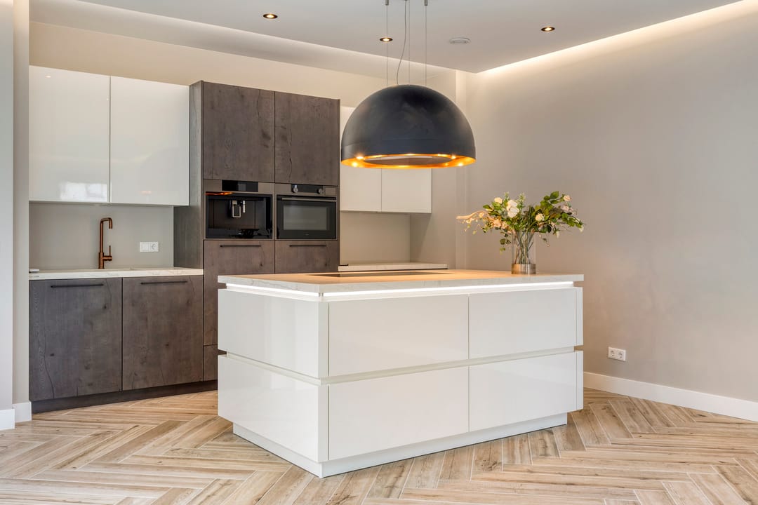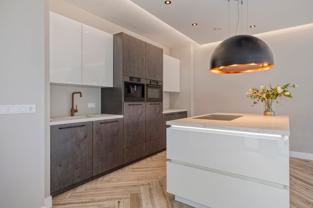 De ruime woonkeuken is voorzien van een moderne en hoogwaardige keukeninrichting met kookeiland, die u alles biedt wat u nodig heeft, met veel werk- en opbergruimte. Zo vindt u hier een combi-stoomoven, een 5-pits inductiekookplaat, moderne afzuigkap, vaatwasser, espressoautomaat en een koelkast. Terwijl u in de keuken bent heeft u een fijn uitzicht over de entree en het voorterrein.
