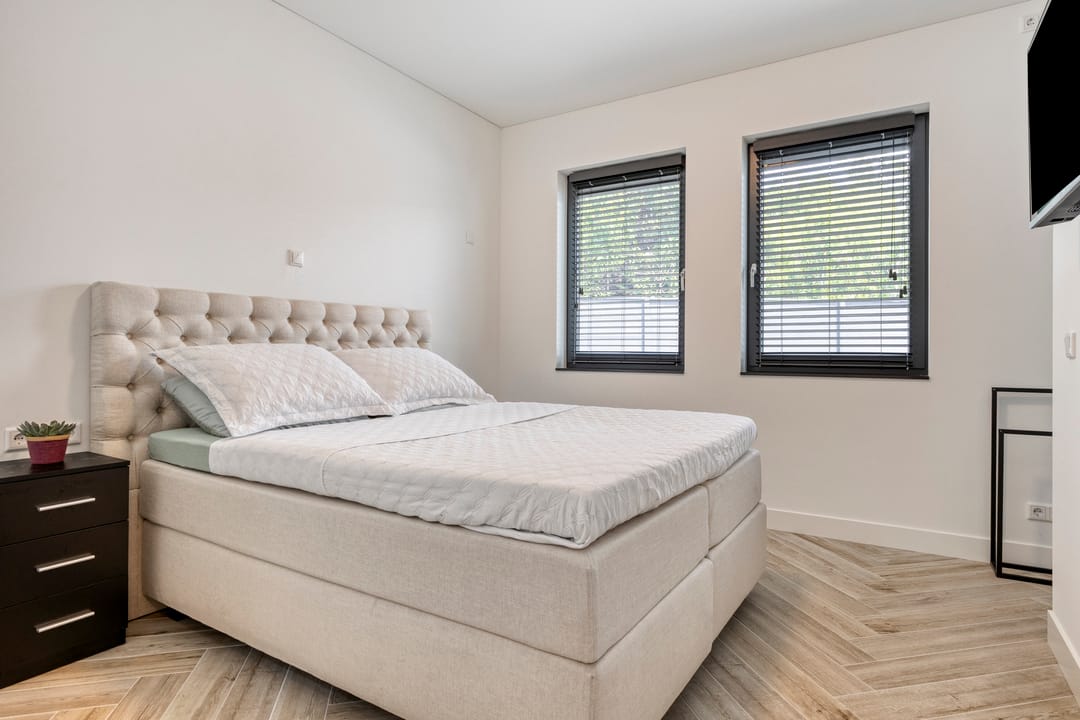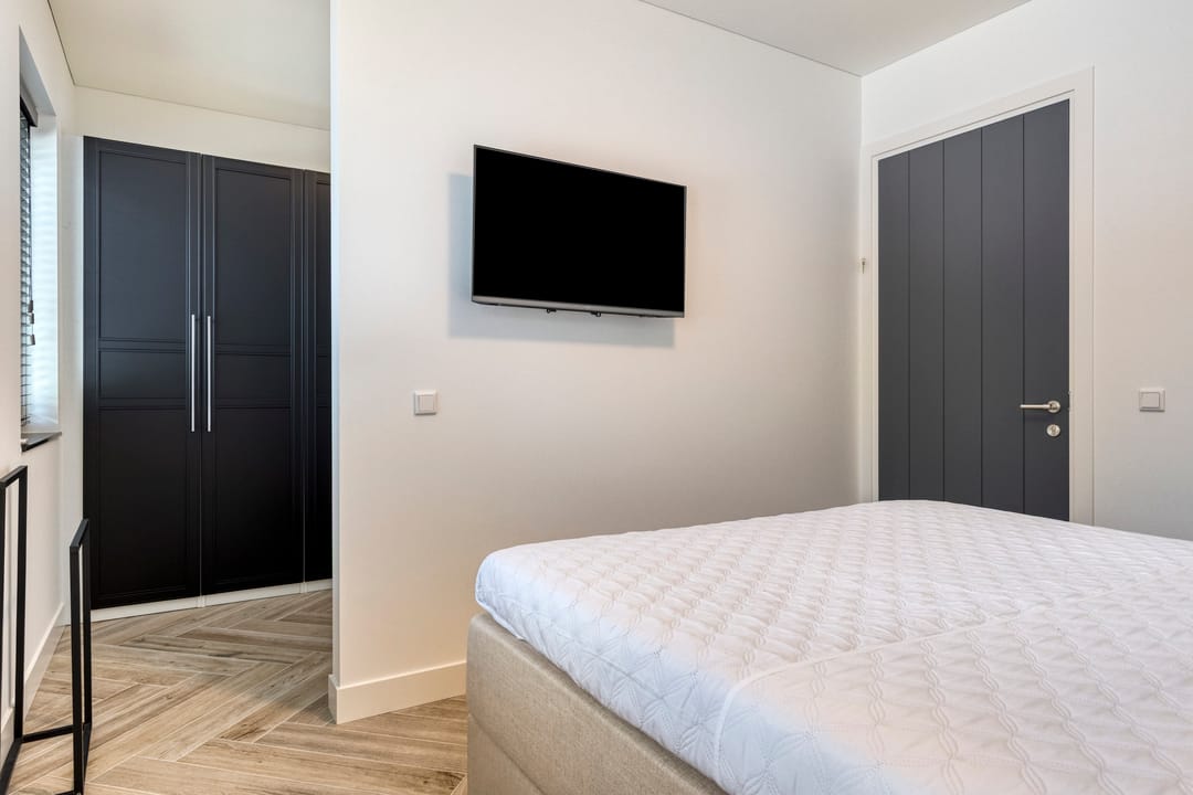 Ruime slaapkamer voorzien van een inloop-garderobe met kastenwanden, airconditioning, TV-aansluiting, diverse internet aansluitingen en aansluiting voor beeldscherm beveiligings camera’s.
