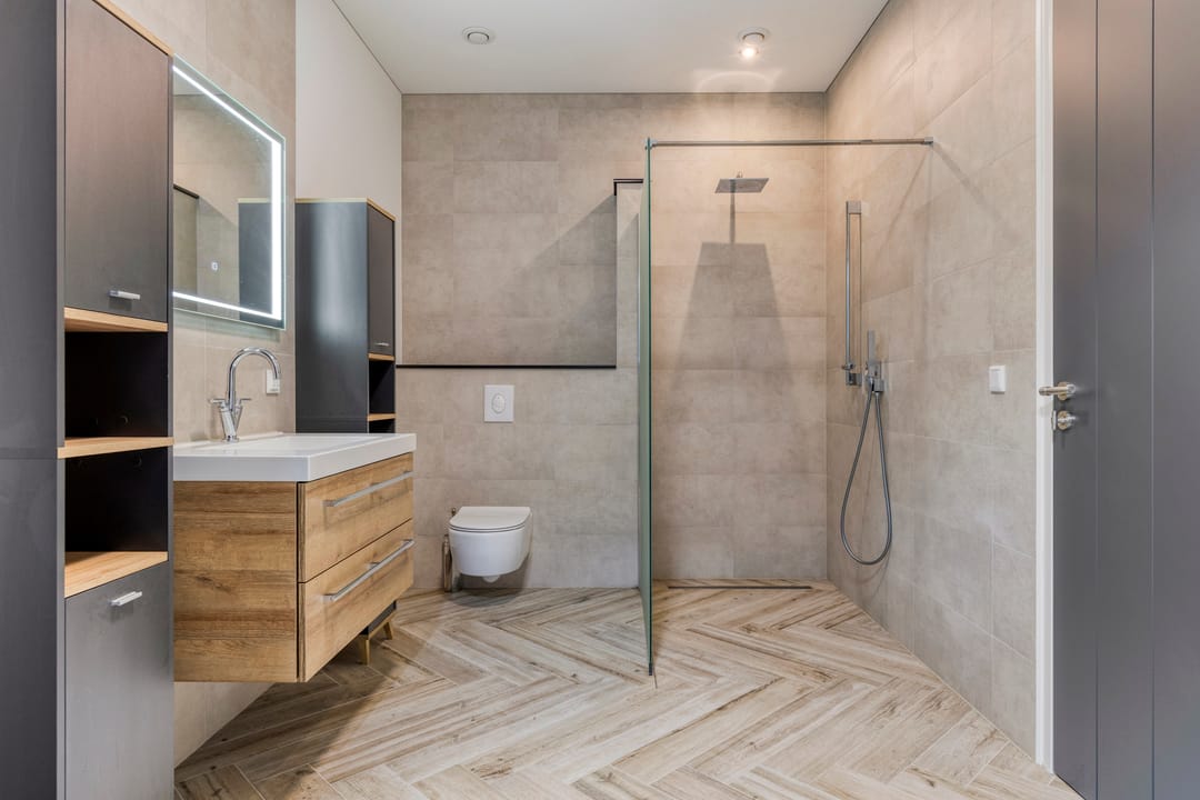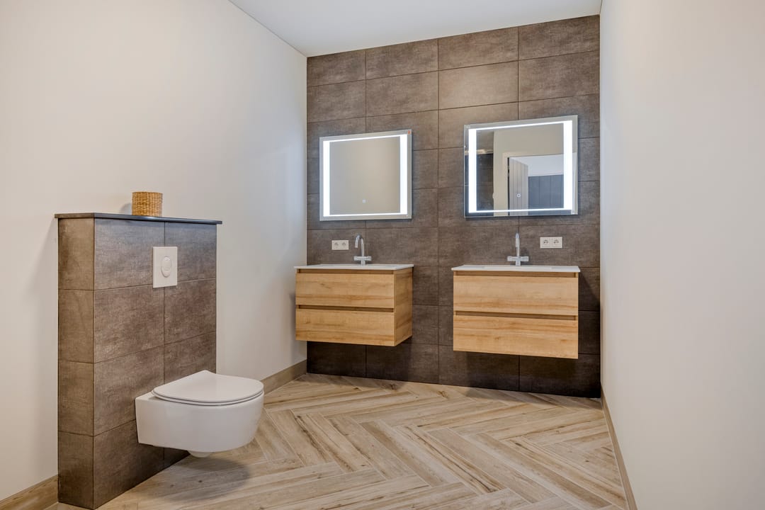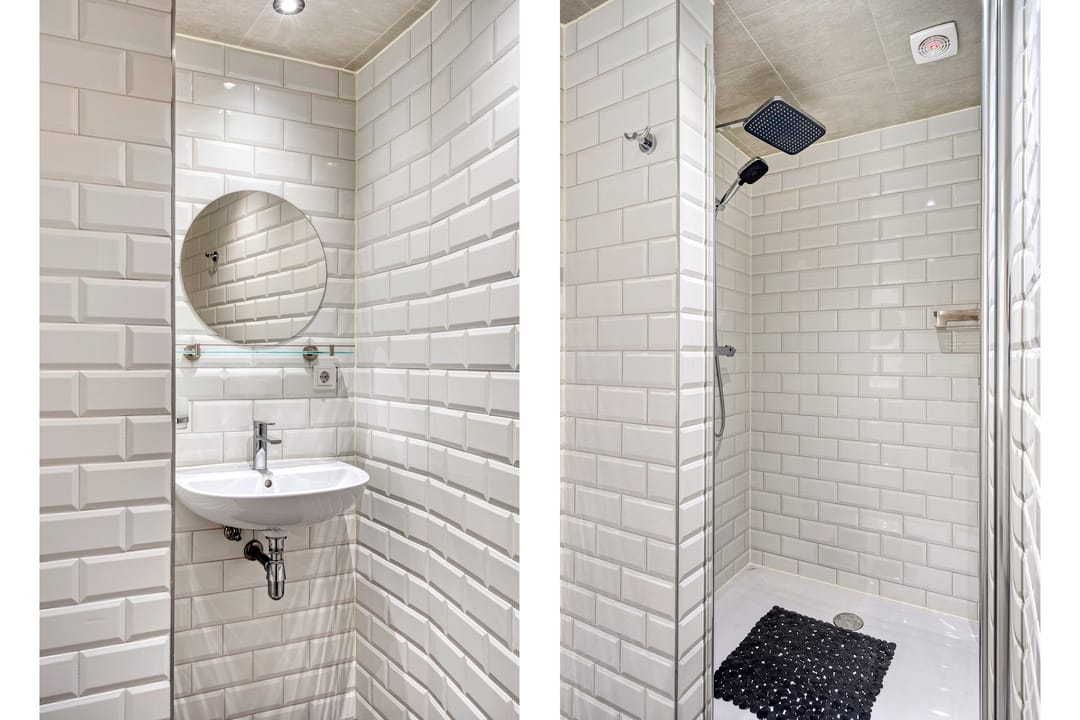 De badkamer beschikt over een royale inloopdouche met rainshower en aparte handdouche en inbouwspots. Dubbele wastafel in meubel, wandcloset, ook hier weer LED verlichting en mechanische afzuiging.