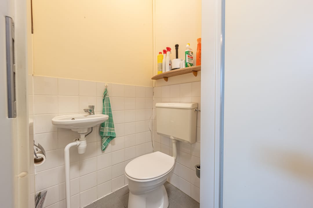 Aansluitend bevindt zich een doucheruimte, volledig betegeld en uitgerust met een douchecabine (handdouche) en wastafel.