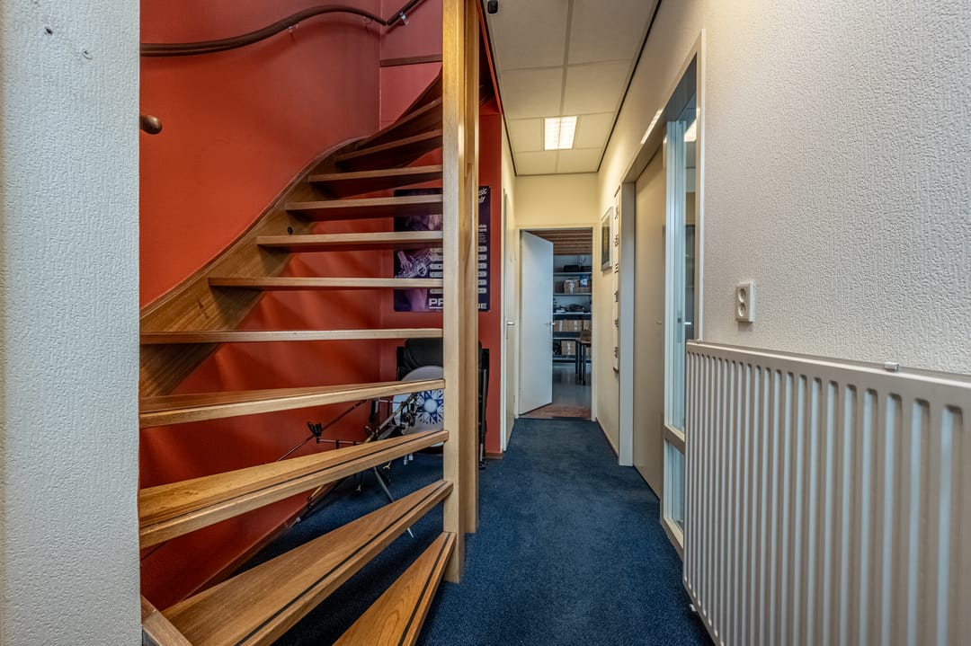 Via de trapopgang bereikt u de eerste verdieping, waar zich meerdere (kantoor)ruimtes bevinden.