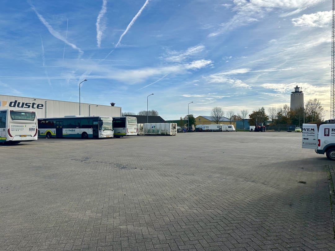 Representatief bedrijfsobject met kantoorruimte en royaal buitenterrein, inclusief ruime parkeergelegenheid, gesitueerd op een perceel van 7.000 m² op bedrijventerrein Stampershoek in Oostburg.
