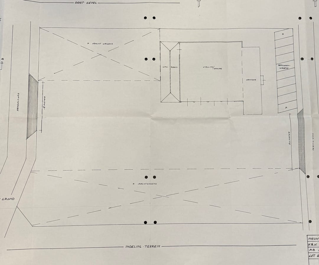 - Kantine van ca. 60 m² (circa 10 × 6 m) met toegang tot de loods