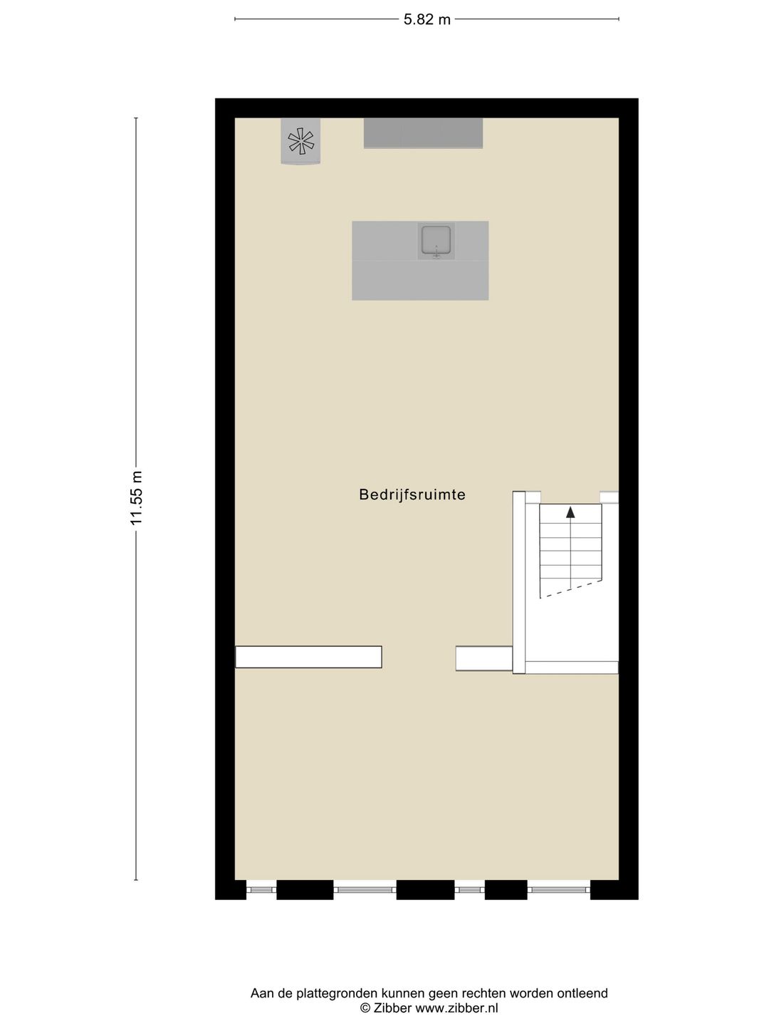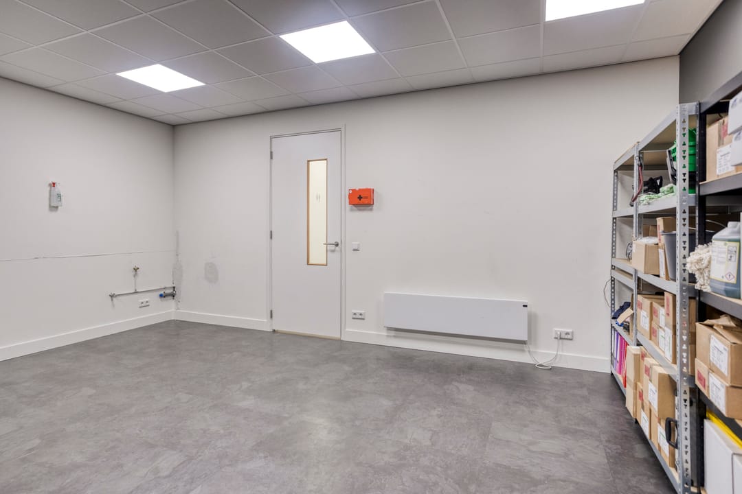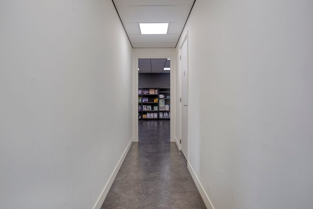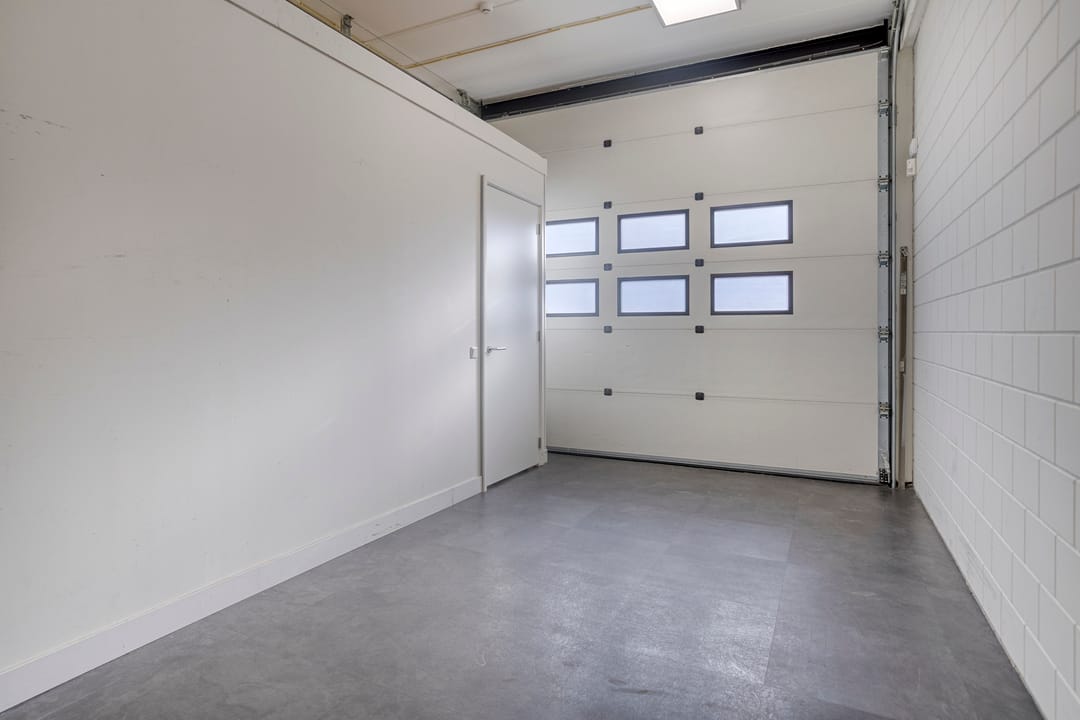 De begane grond is voorzien van een entree, meterkast met water-, elektriciteits- en telefoonaansluiting, een gang met toegang tot de magazijnruimte, spreekruimte/opslagruimte en een moderne toiletruimte met hangcloset en wastafel. De magazijnruimte beschikt over een PVC-vloer, een handmatig bedienbare overheaddeur (afmetingen: 3,5 meter hoog x 3,7 meter breed), ledverlichting en een poederblusser.