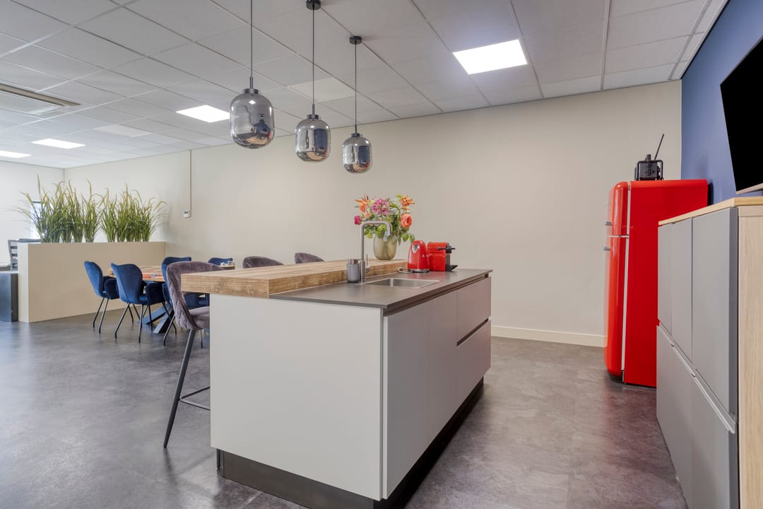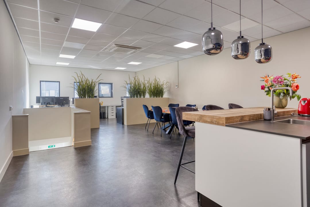 De verdiepingsvloer is bereikbaar via een houten trap met geïntegreerde led-strips in de trapleuning. Alle binnenwanden zijn gestuct en de ruimte is voorzien van een PVC-vloer, systeemplafond met ledverlichting, een airco-unit, kabelgoten en elektrische verwarmingspanelen. De ramen in de voorgevel (deels te openen) zorgen voor een prettige lichtinval. Daarnaast is de kantoorruimte uitgerust met een uitgebreide, in het oog springende pantry met bijpassende kastenwand aan de achterzijde. Deze is voorzien van een wasbak, kraan en close-in boiler.