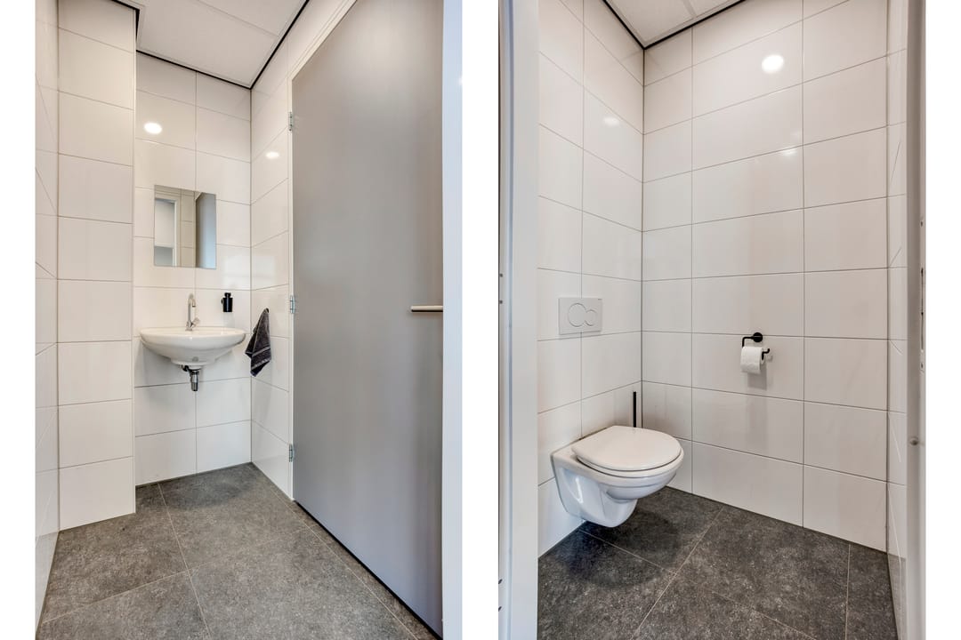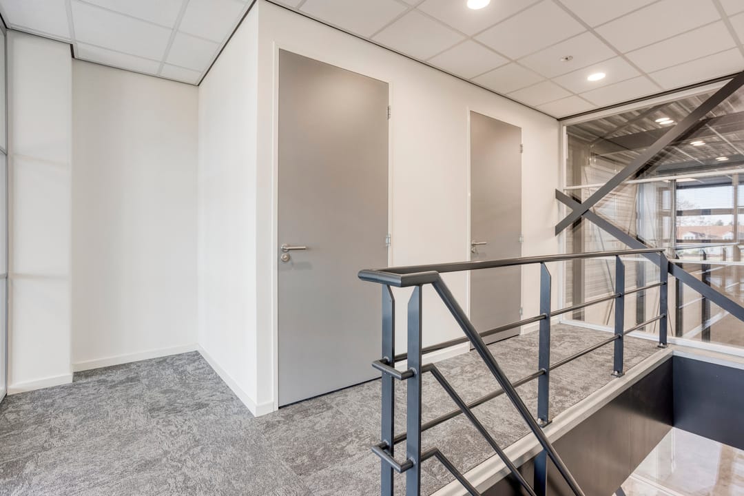 De kantoorruimte is voorzien van een eigen meterkast met volledige nutsaansluitingen, een 3x25 ampère krachtstroomaansluiting en een glasvezelaansluiting. De afwerking bestaat uit gevlinderde betonvloeren, grotendeels glazen scheidingswanden en een systeemplafond voorzien van LED-verlichting. Verwarming vindt plaats via een HR c.v.-installatie met convectoren en ventilatie geschiedt middels een WTW-unit. Zowel op de begane grond als op de eerste verdieping is een toilet met voorportaal en fonteintje aanwezig. Op de verdieping bevindt zich tevens een pantry. Daarnaast worden, buiten het gehuurde om en om niet aan huurder ter beschikking gesteld: airconditioning op de verdieping, vloerbedekking en lamellen.