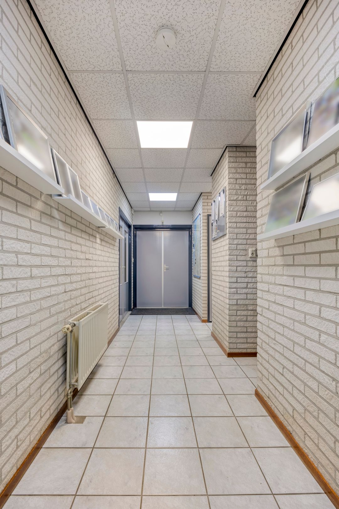 De begane grond beschikt over een nette entree met hal die toegang biedt tot meerdere ruimten. De kantoorruimte is modern afgewerkt en voorzien van een systeemplafond, grote raampartijen en een fraaie vloerafwerking, waardoor de ruimtes licht en comfortabel aanvoelen.